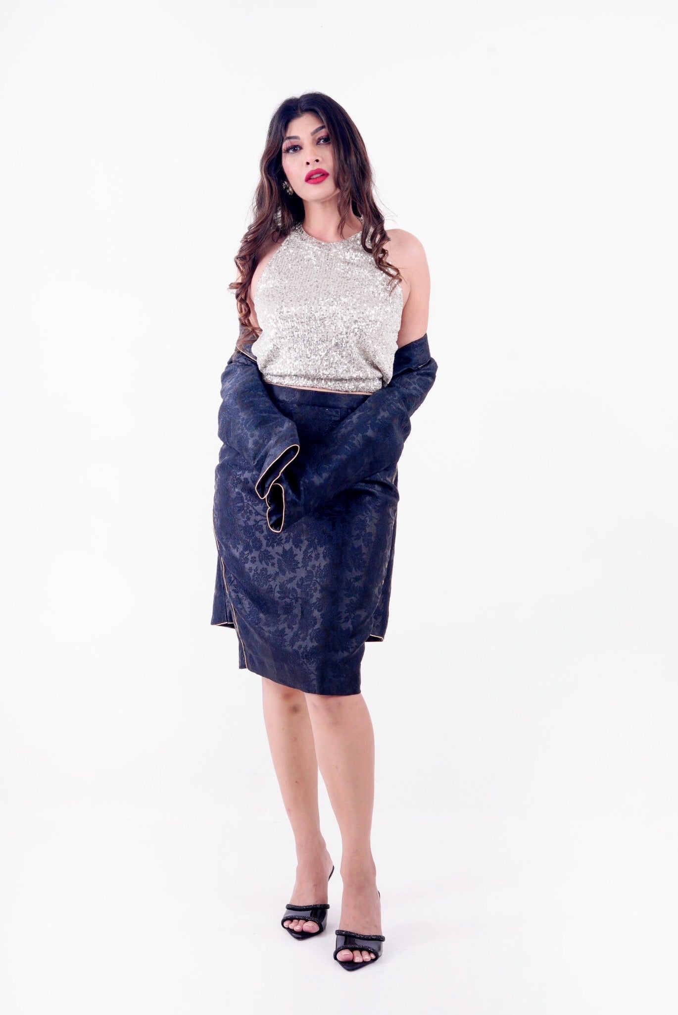 The Black Panther Business Suit features full-length jacket and high waist pencil skirt, adorned with golden piping, proving that professional fashion doesn't have to be boring. With a chic and stylish jacquard weave twist, this ensemble is suitable for every personality, body type and profession.
