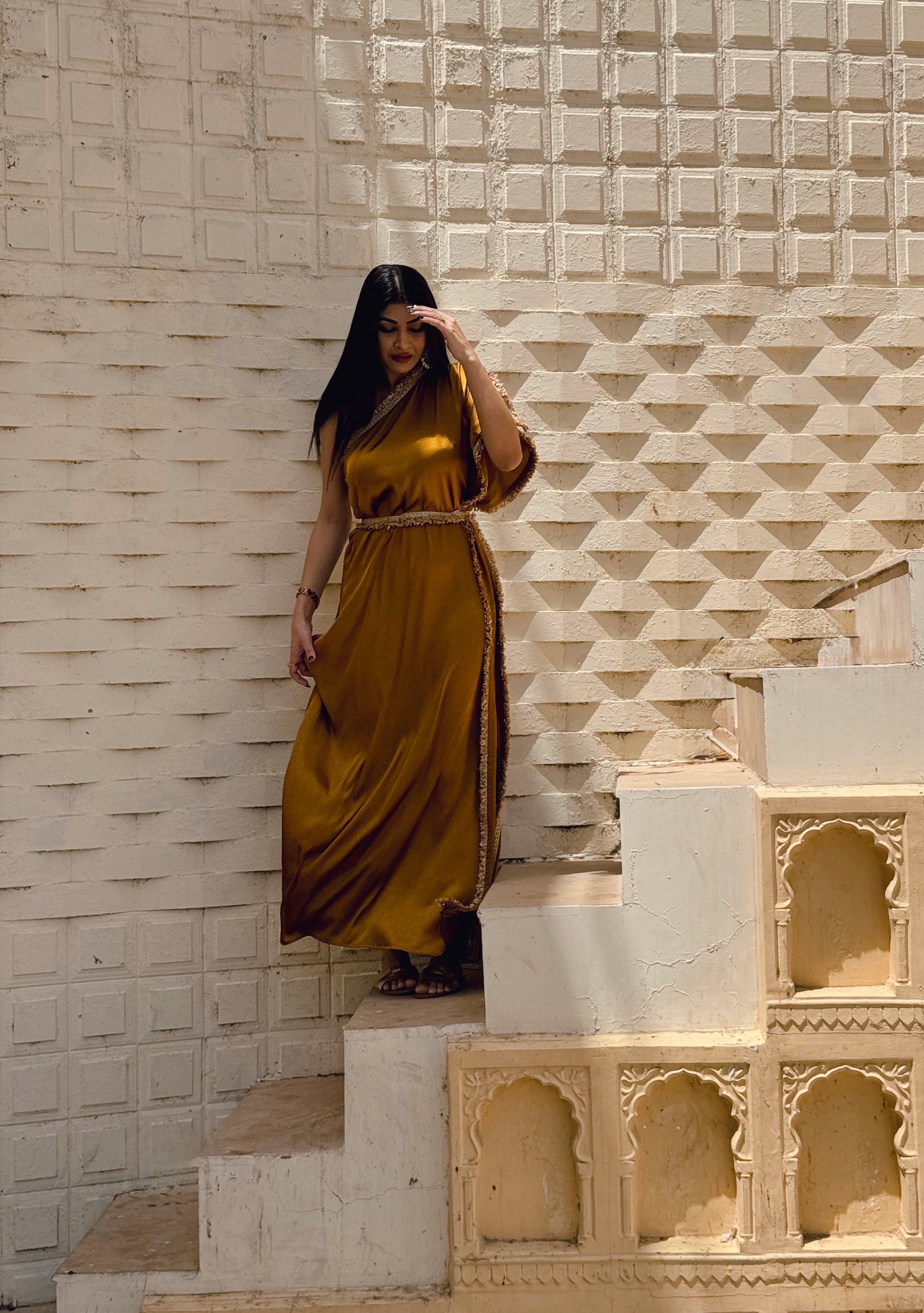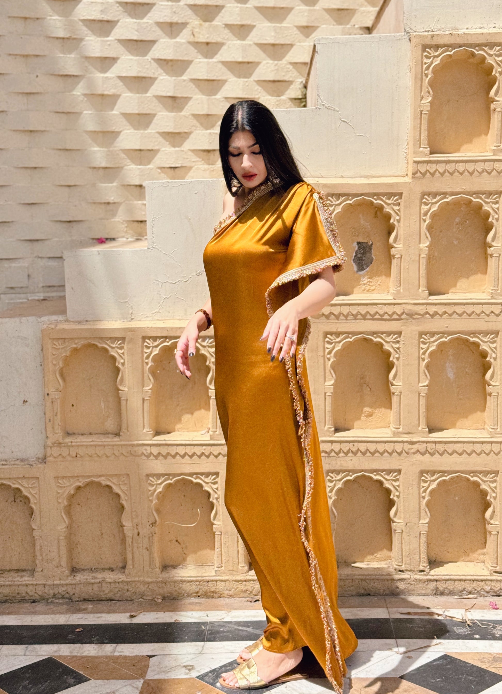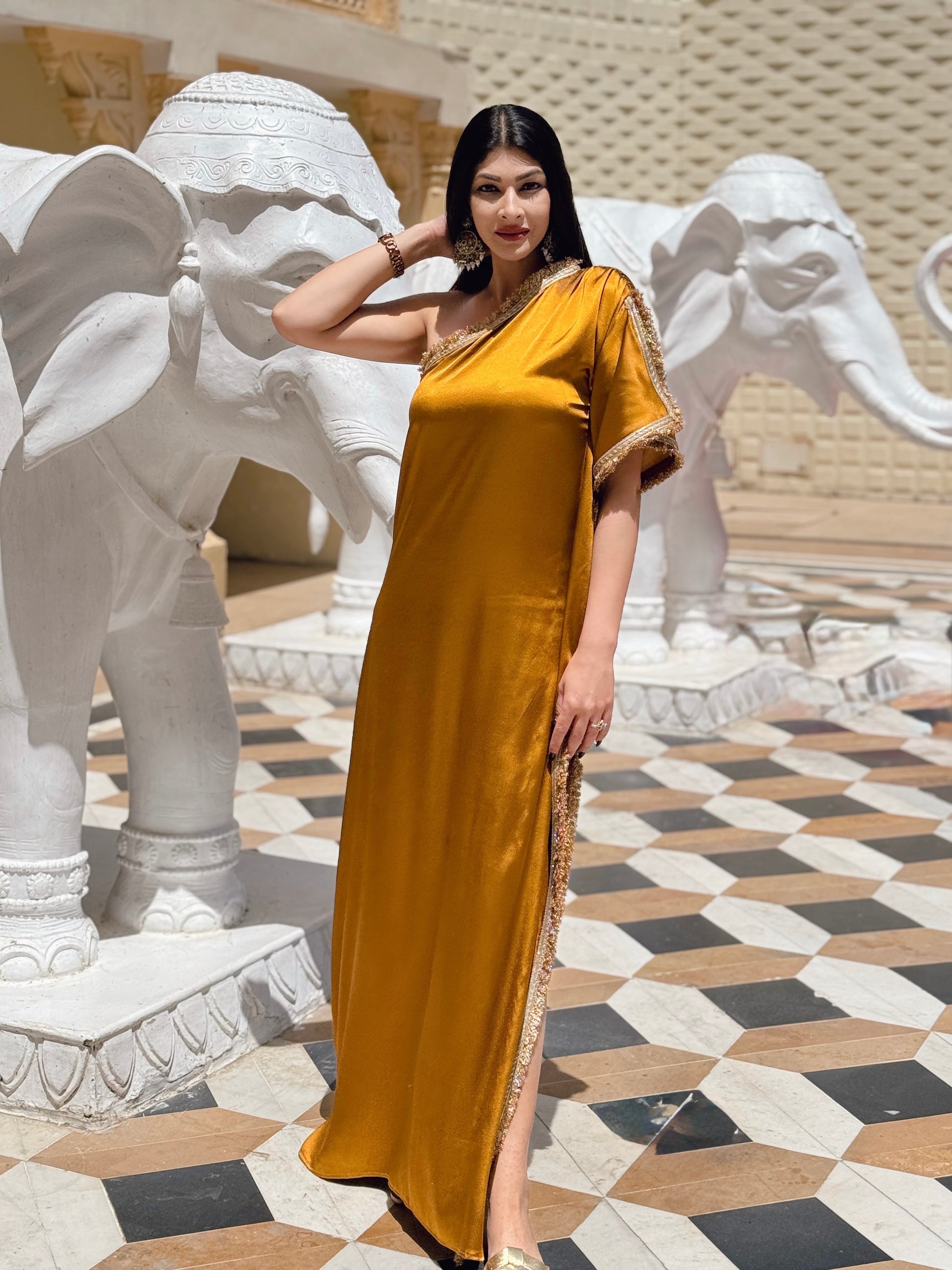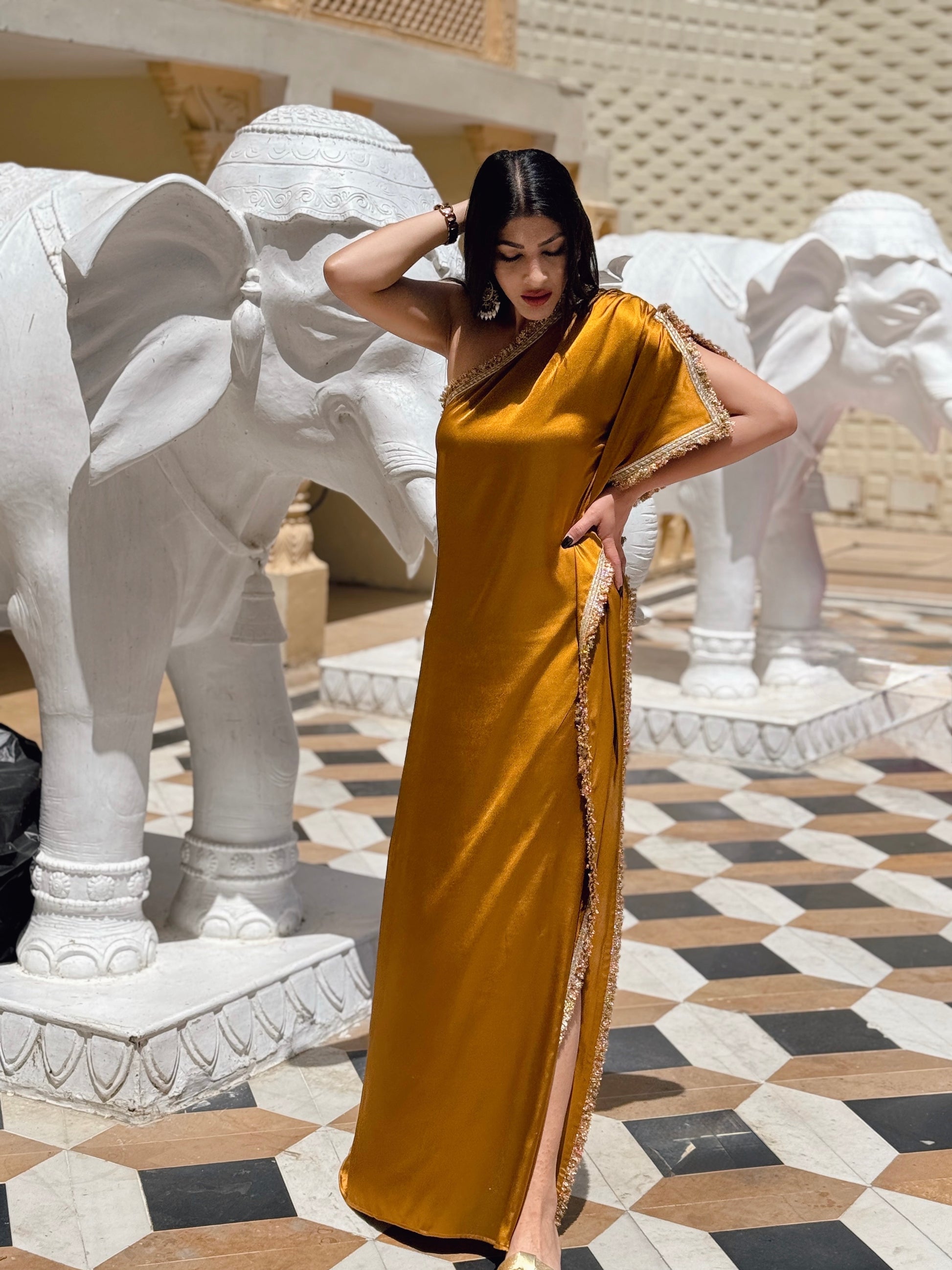 Embrace elegance and sophistication with our Amber Satin Kaftan With Gota Belt (free gift). Stand out at any festive occasion or wedding affair with this head-turning piece. The vibrant Amber hue with gold gota detailing is guaranteed to make a statement. Elevate your style and turn heads with this exclusive one shoulder kaftan suitable for all body types and personalities. Versatile piece can be styled with or without belt. Sweet surprise for the fashionistas.