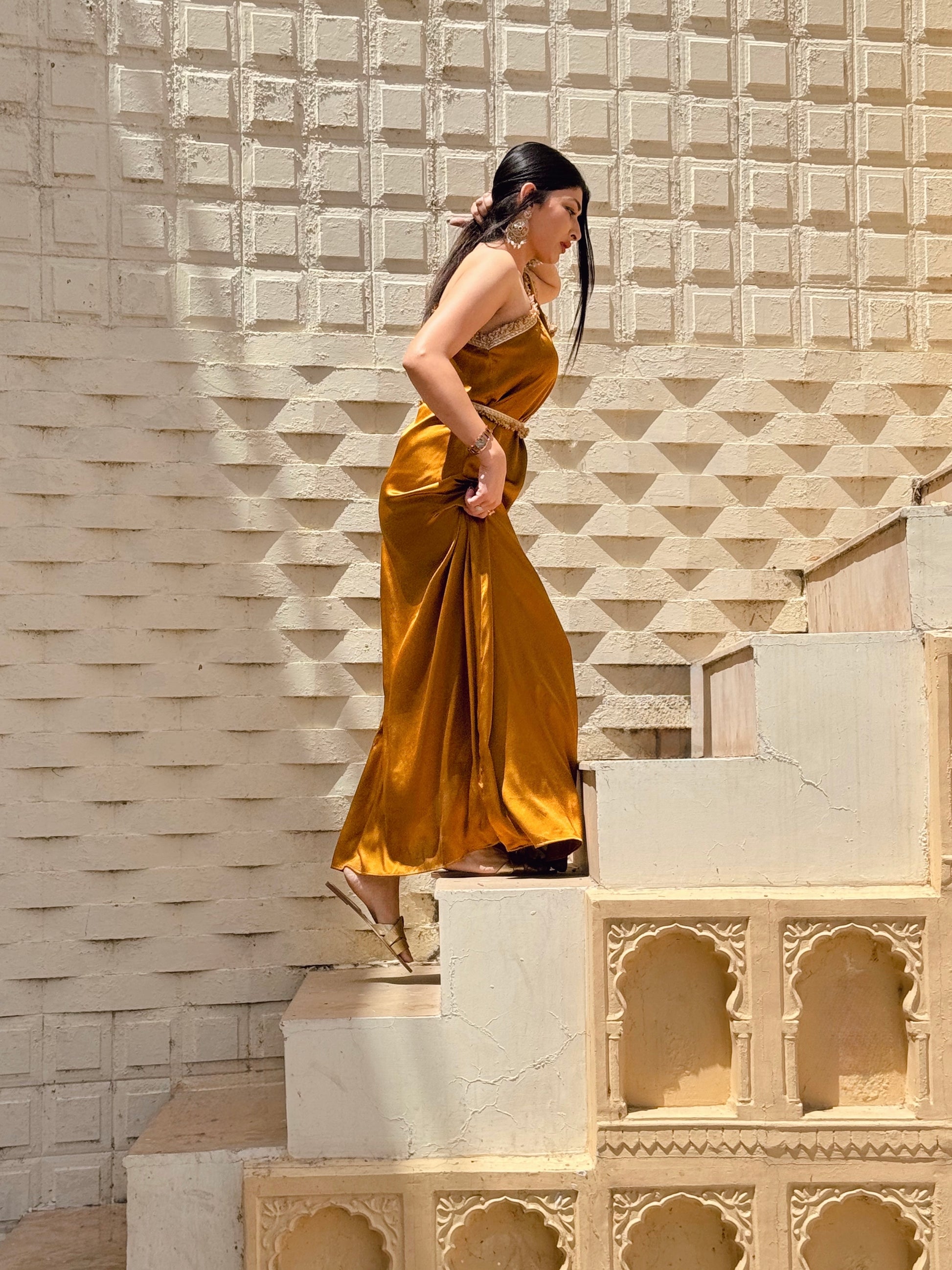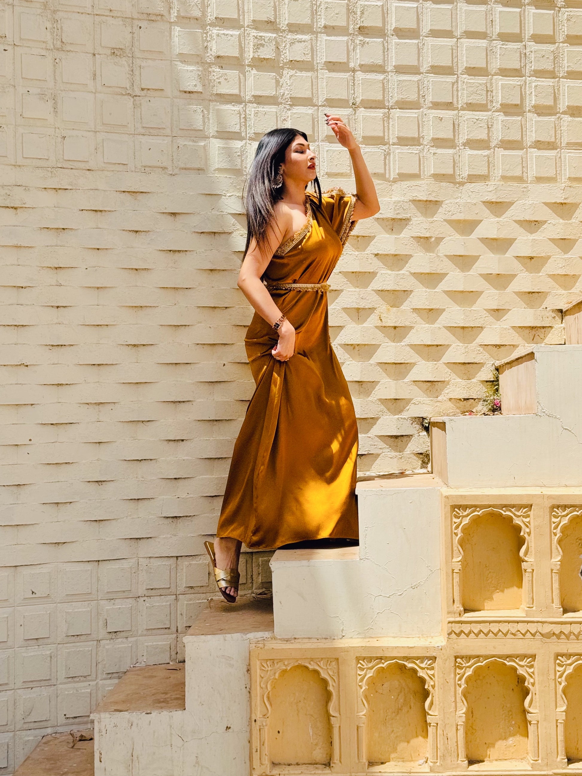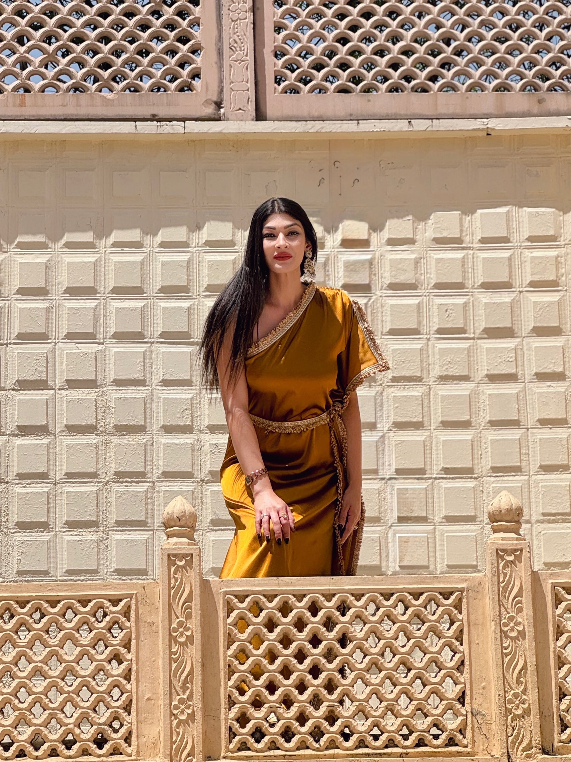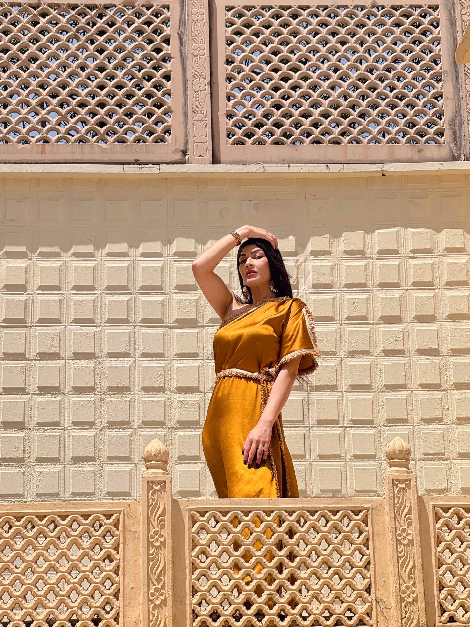 Embrace elegance and sophistication with our Amber Satin Kaftan With Gota Belt (free gift). Stand out at any festive occasion or wedding affair with this head-turning piece. The vibrant Amber hue with gold gota detailing is guaranteed to make a statement. Elevate your style and turn heads with this exclusive one shoulder kaftan suitable for all body types and personalities. Versatile piece can be styled with or without belt. Sweet surprise for the fashionistas.