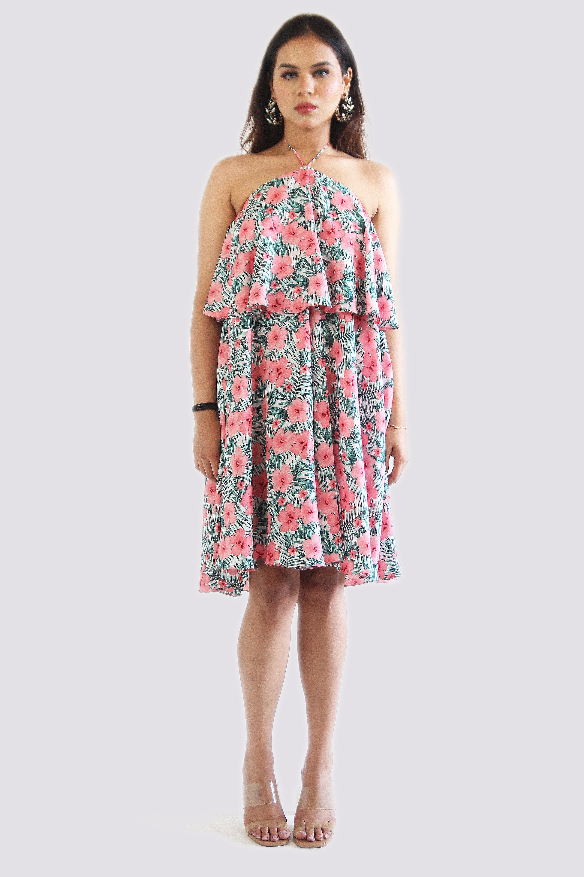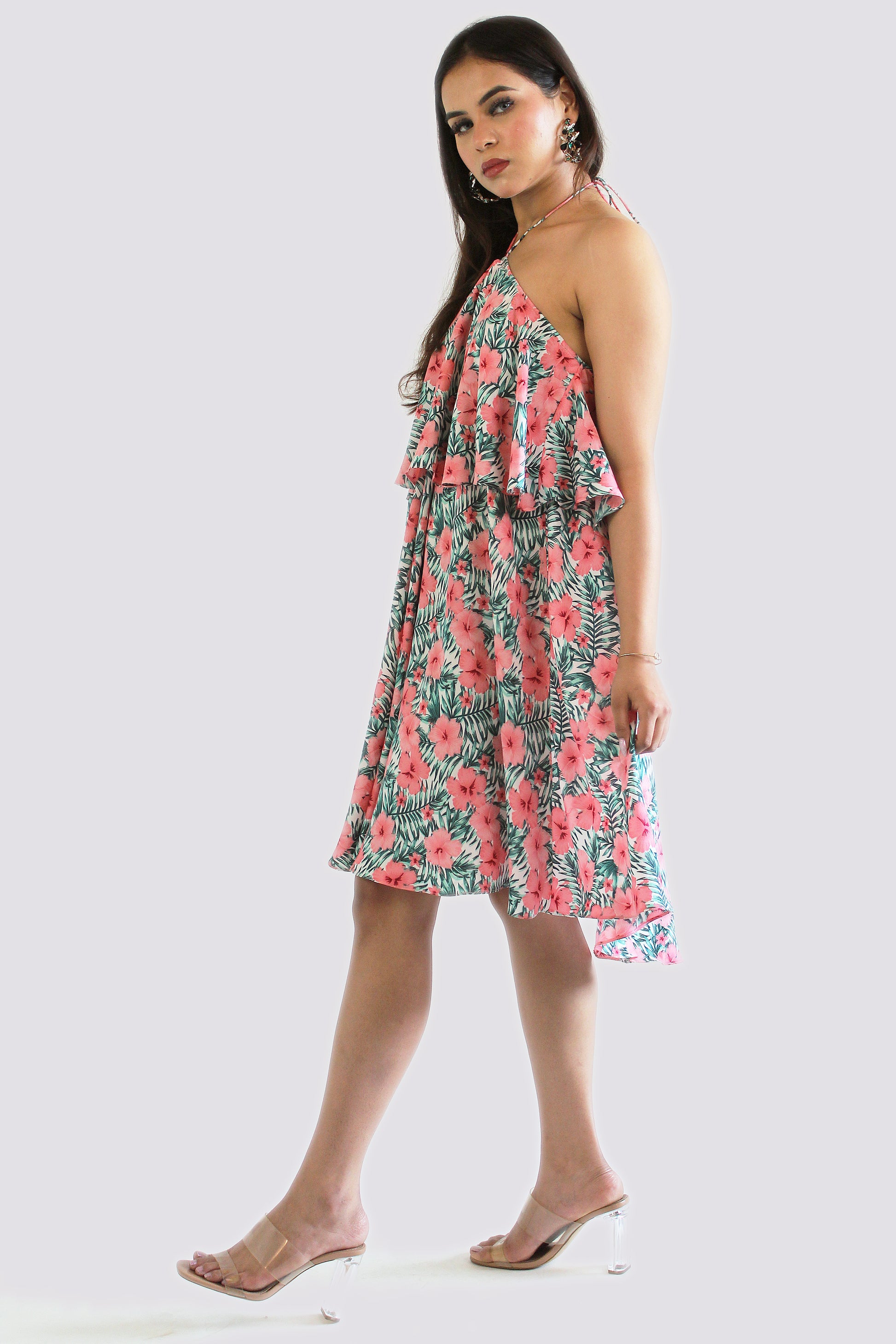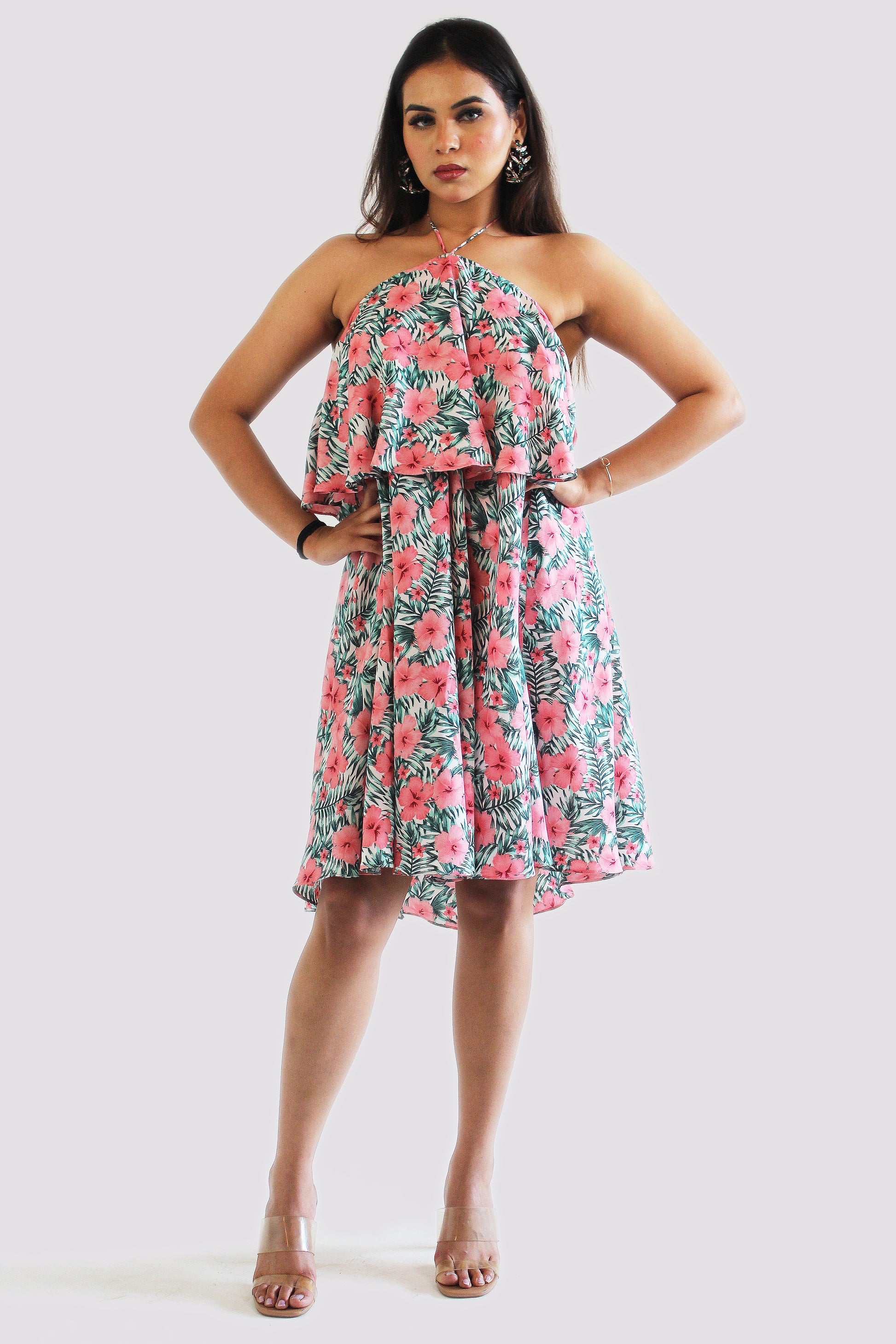 Introducing the Glam Fam Halter Dress - the perfect addition to your holiday, outing, or party wardrobe. Made with breezy floral fabric and a halter neck design, this floral layer dress exudes playful summer vibes. Lounging has never looked so glamorous!