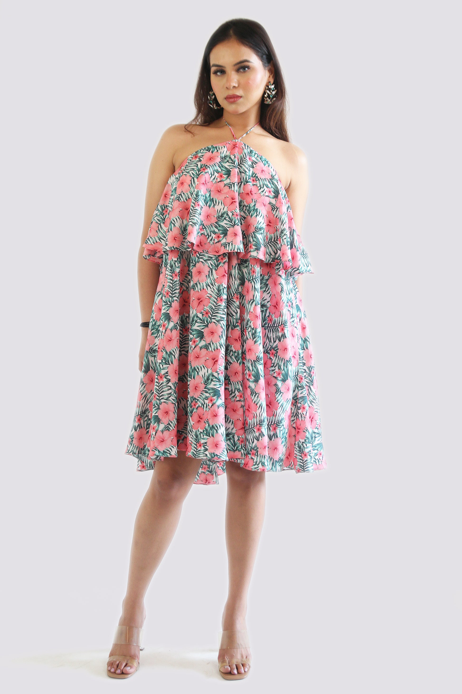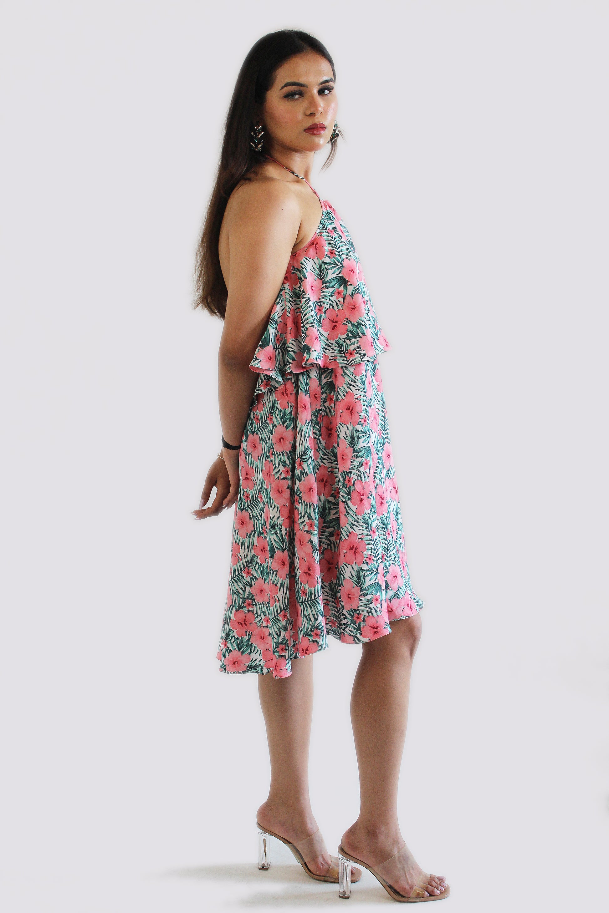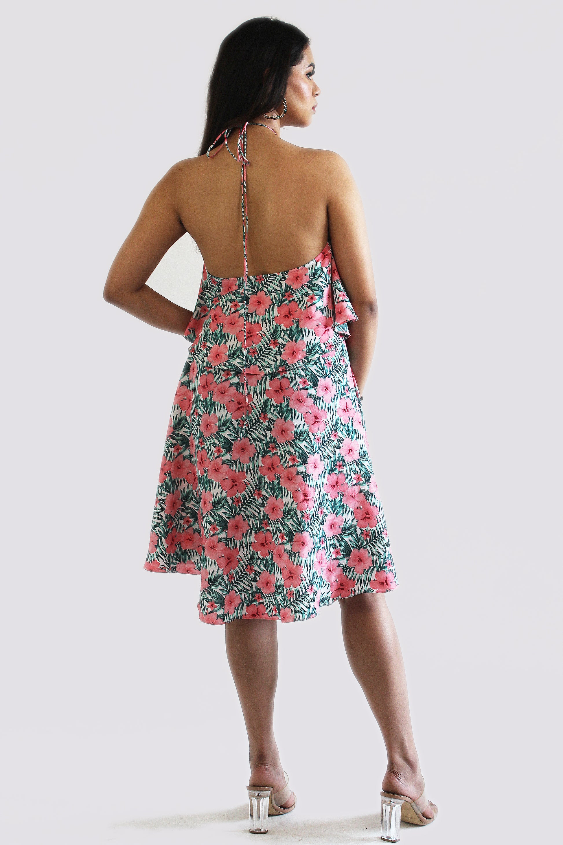 Introducing the Glam Fam Halter Dress - the perfect addition to your holiday, outing, or party wardrobe. Made with breezy floral fabric and a halter neck design, this floral layer dress exudes playful summer vibes. Lounging has never looked so glamorous!