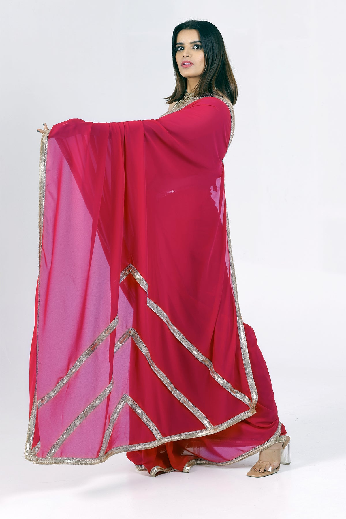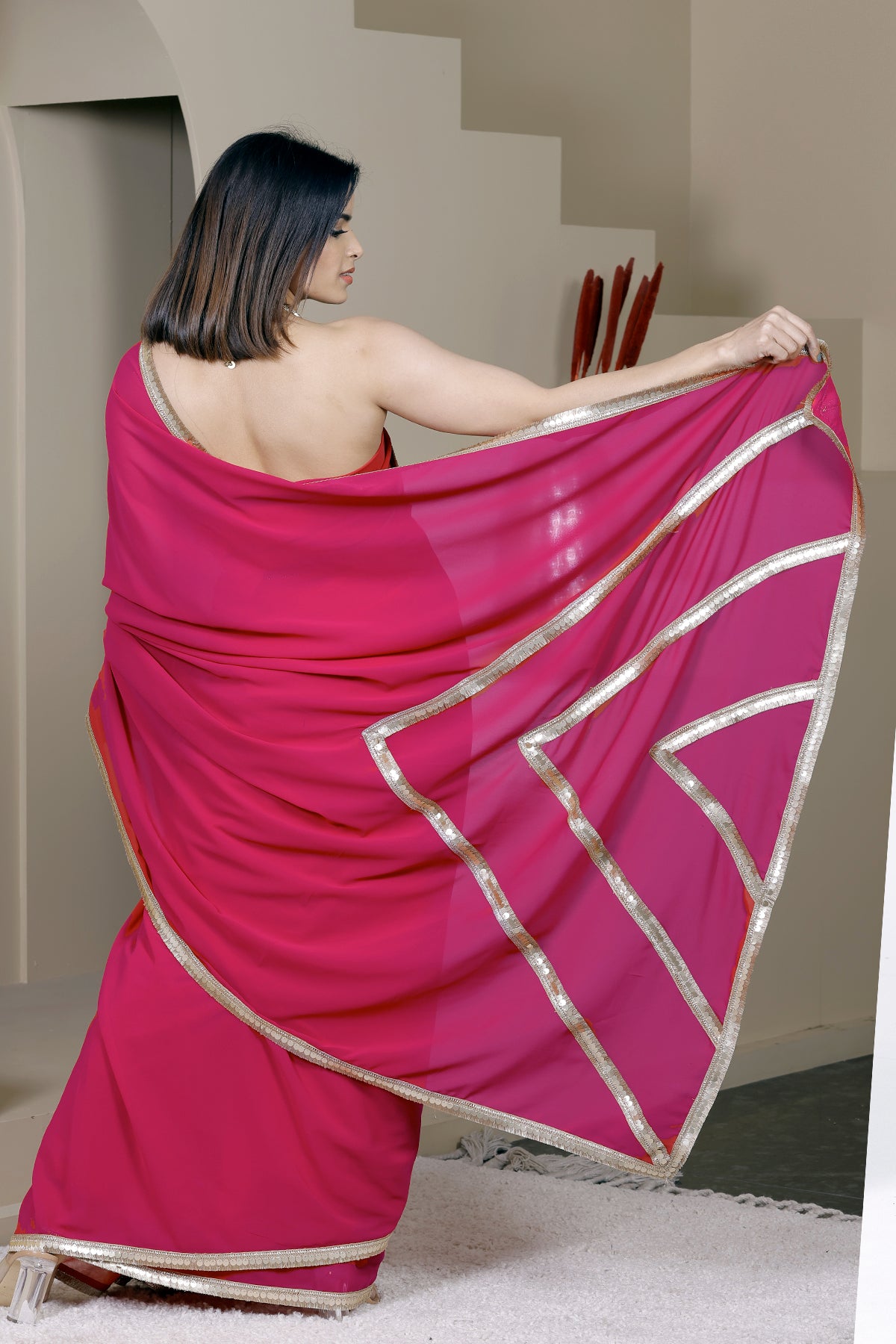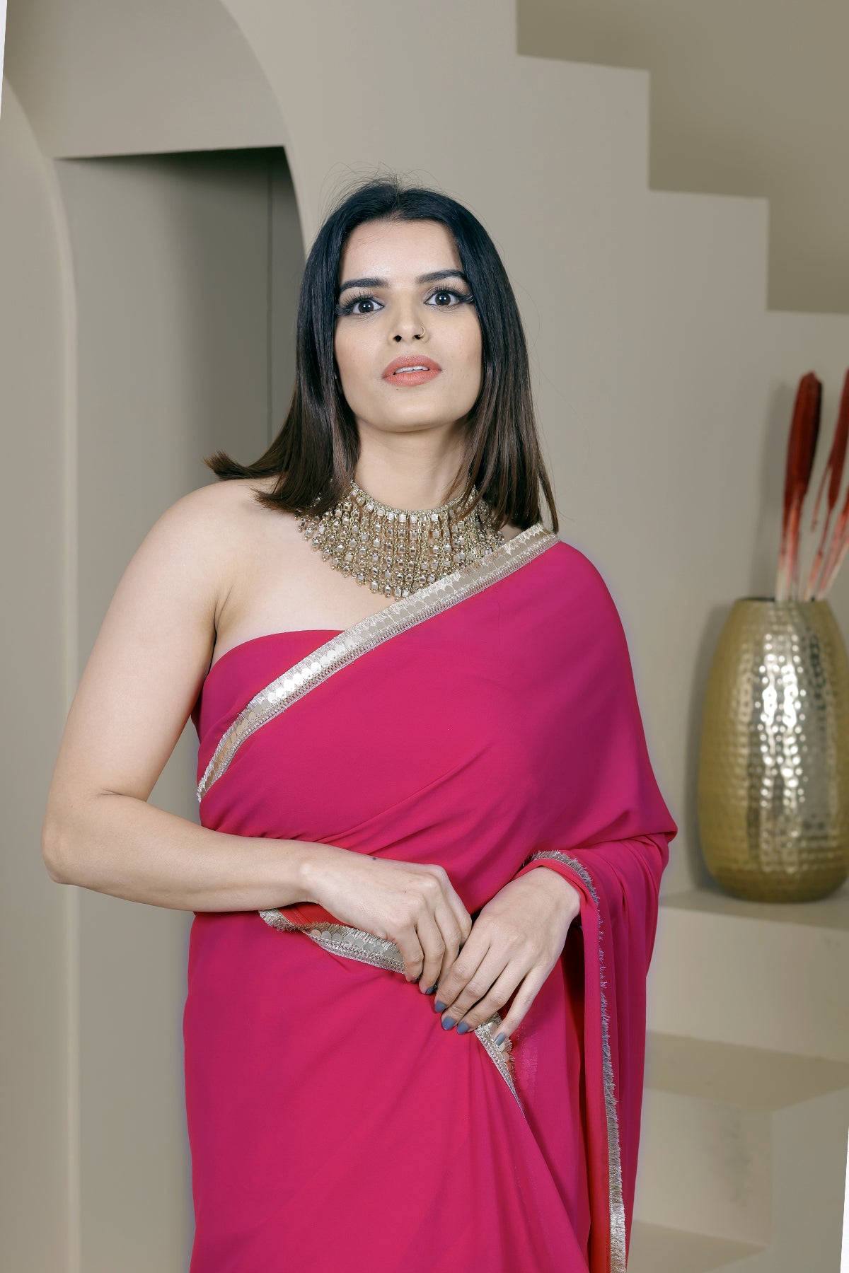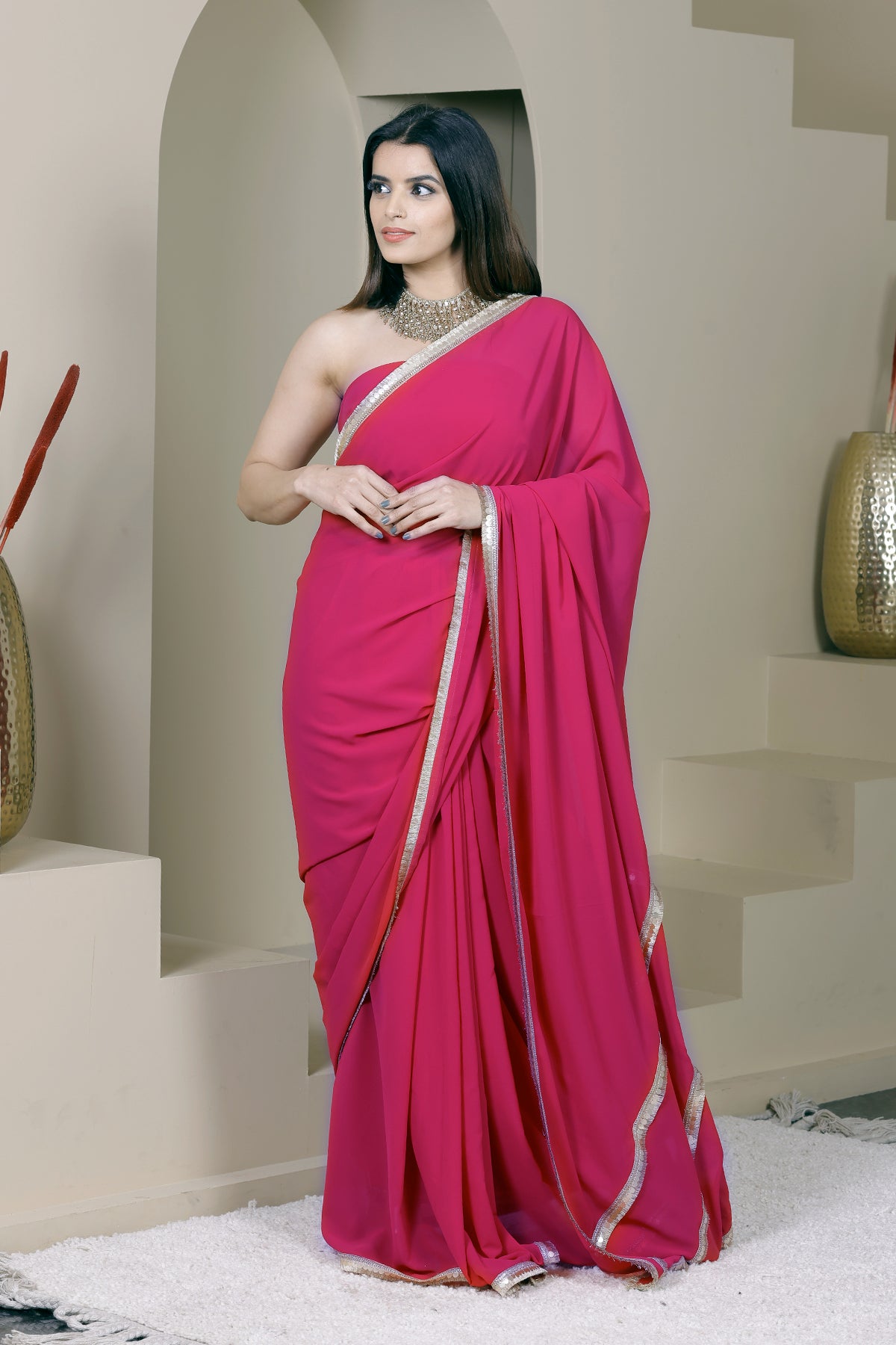 This fuchsia pink georgette saree with gold detailing exudes luxury, glam, and classy royalty. Elevate your style with this elegant and exclusive piece from the Gulaal Saree Collection.
