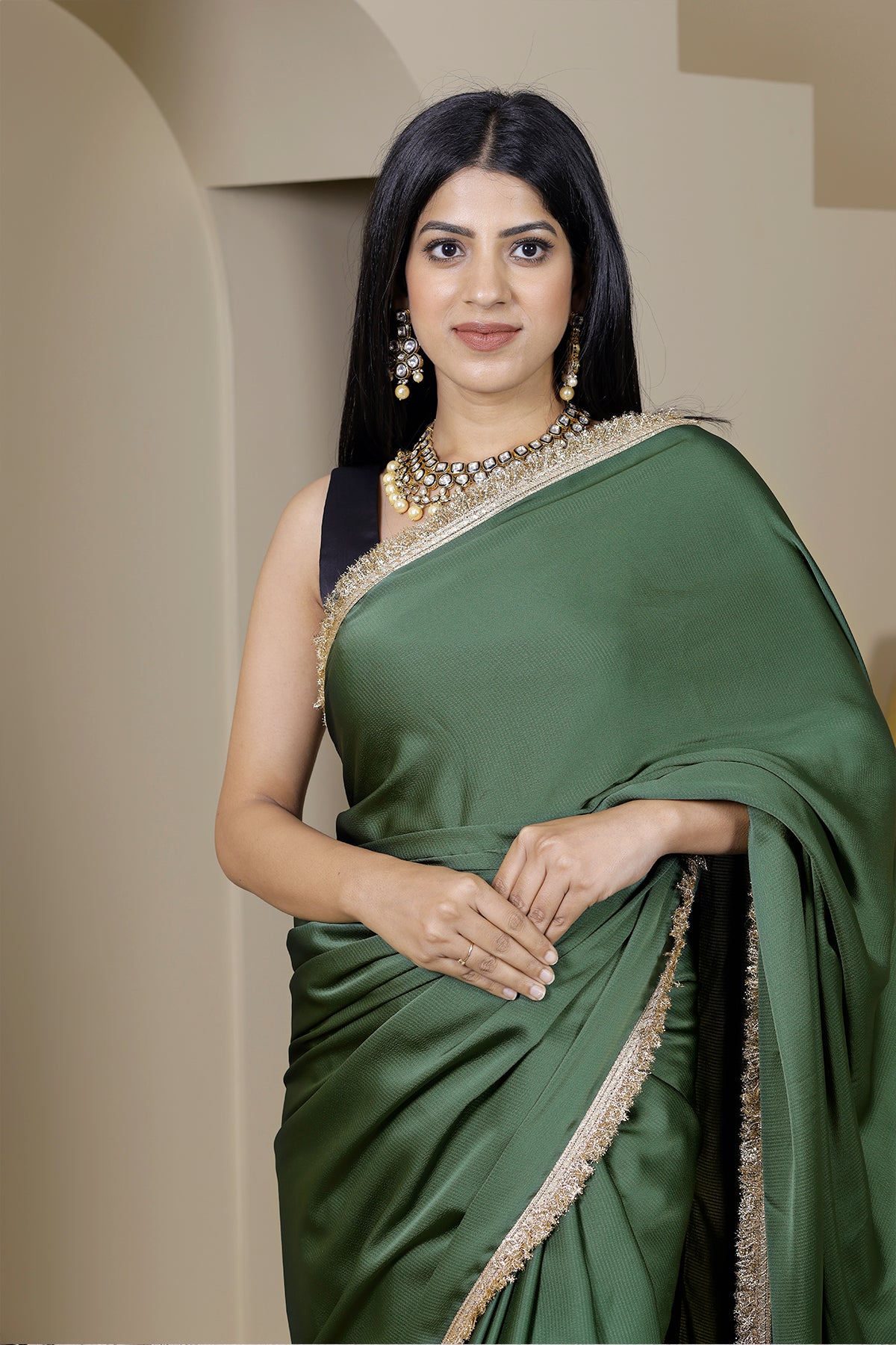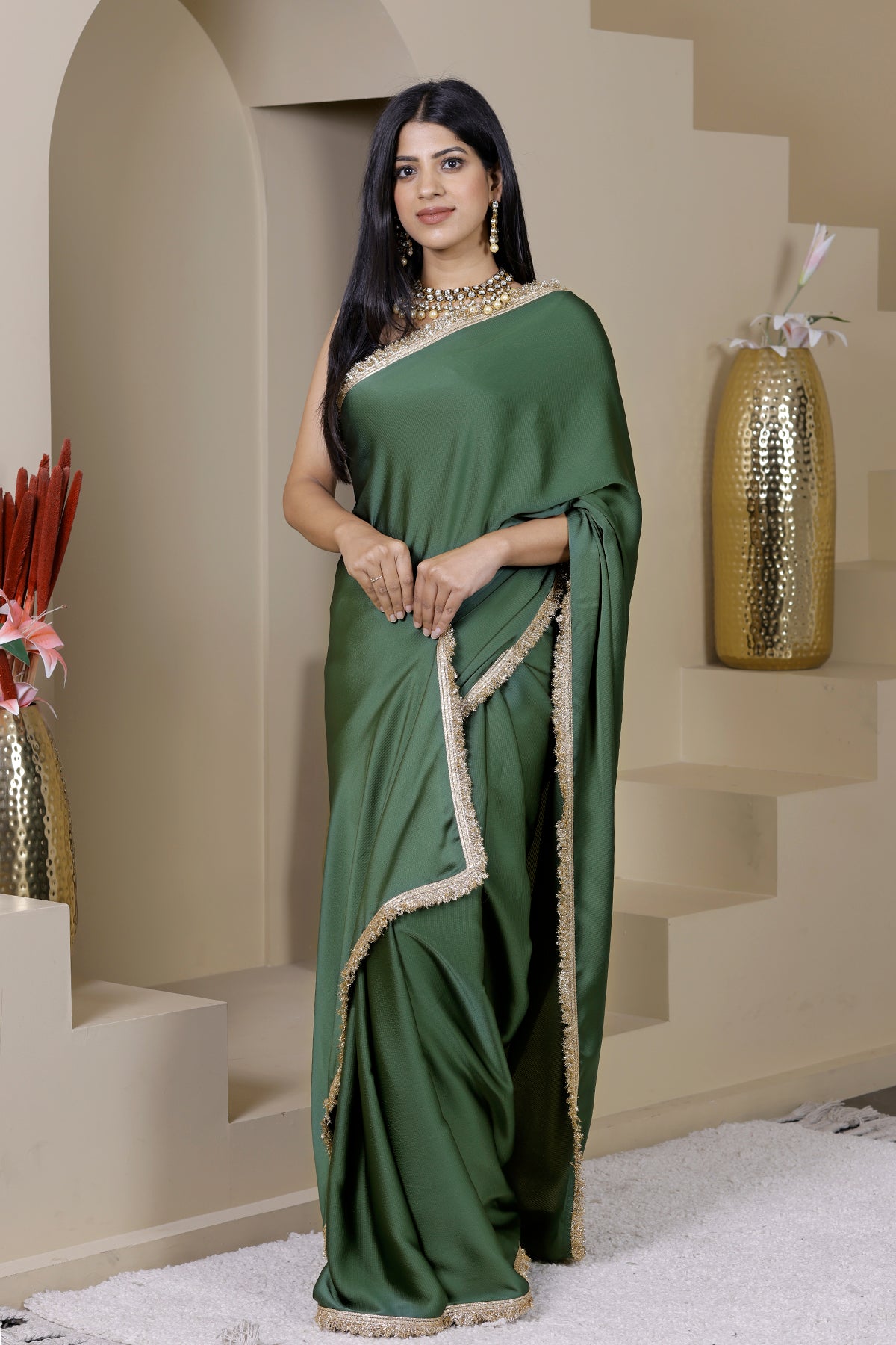 Saree- Green Satin Crepe with Gold Gota Border