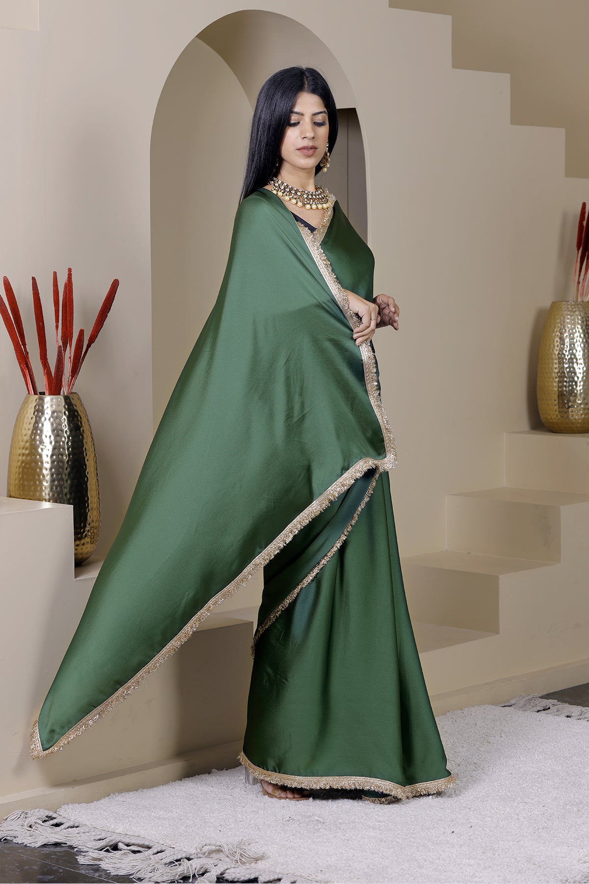 This green colored satin crepe saree with gold gota border exudes luxury, glam, and classy royalty. Elevate your style with this elegant and exclusive piece from the Gulaal Saree Collection.