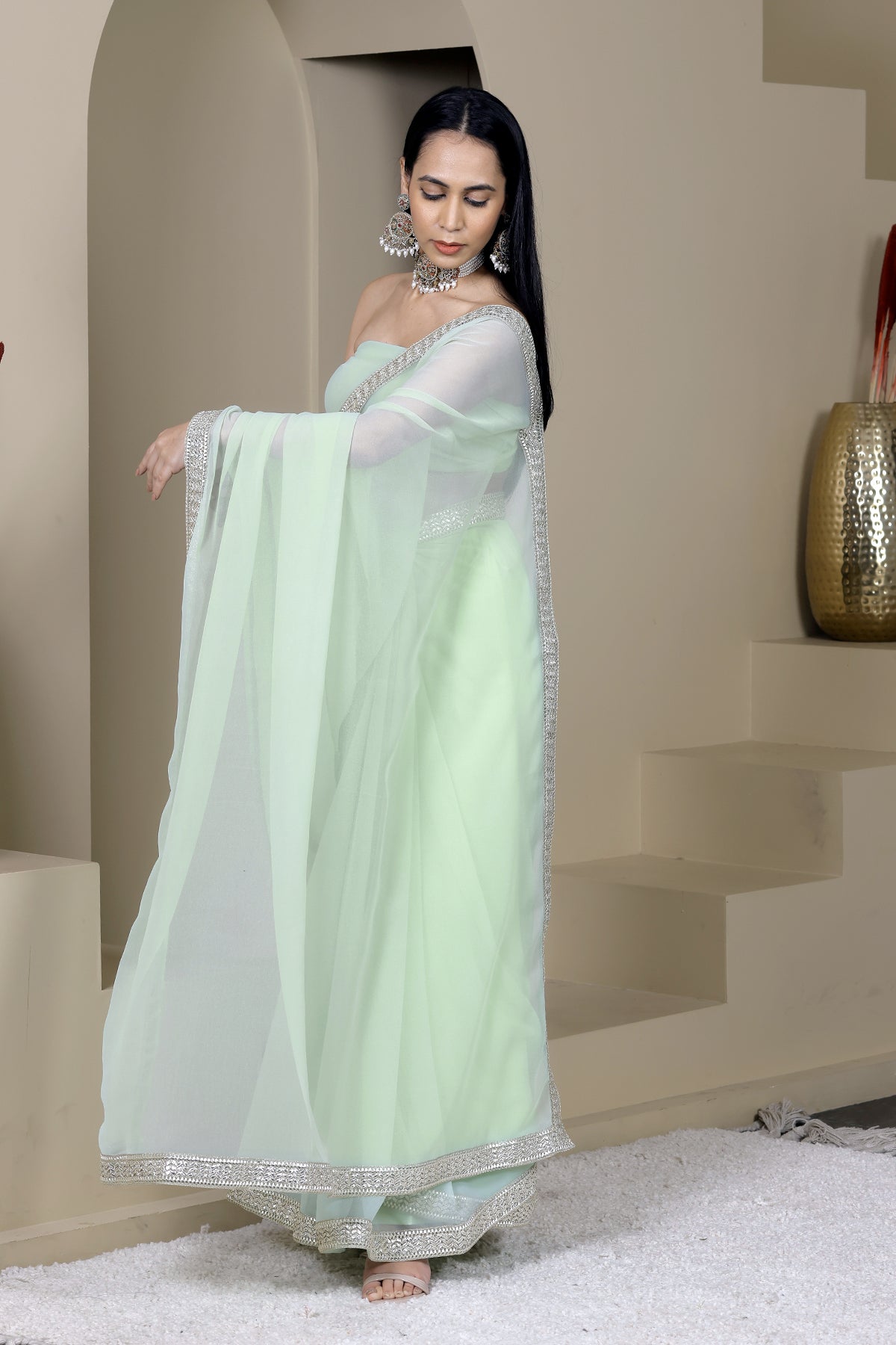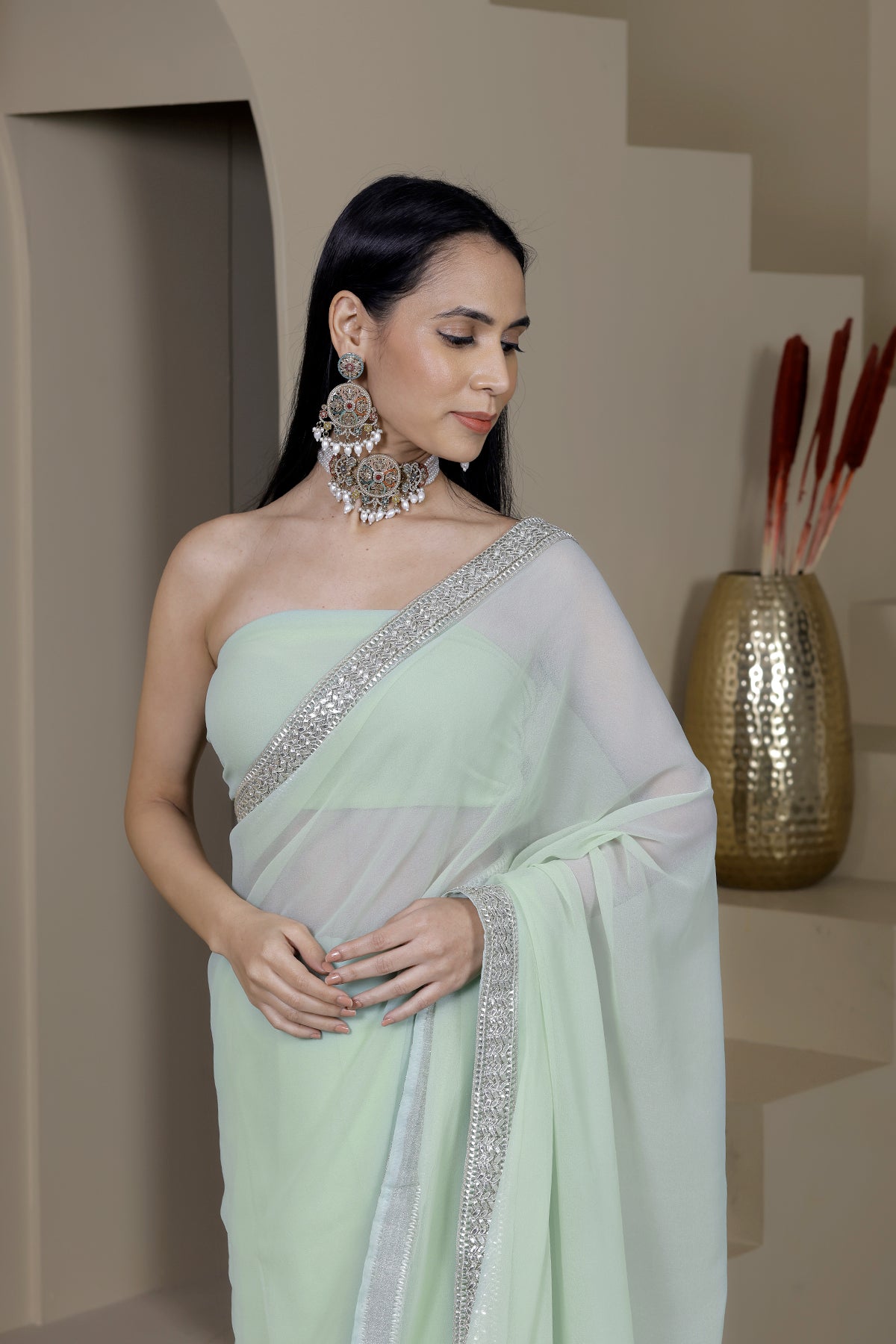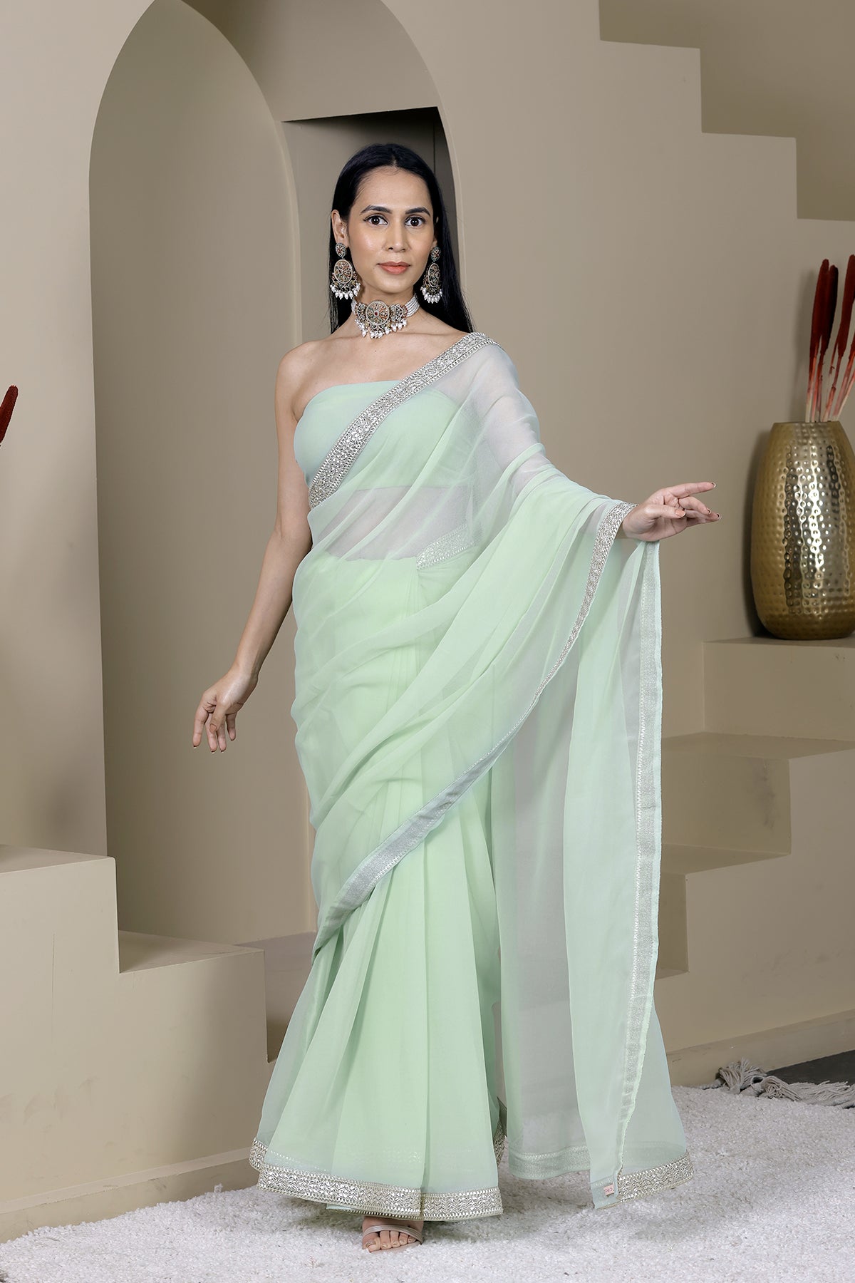 This pista green lightweight georgette saree with gold lace detailing exudes luxury, glam, and classy royalty. Elevate your style with this elegant and exclusive piece from the Suhani Saree Collection.