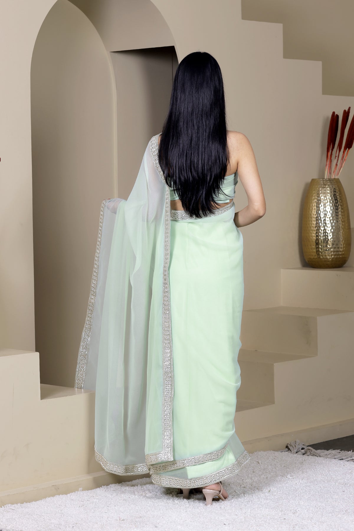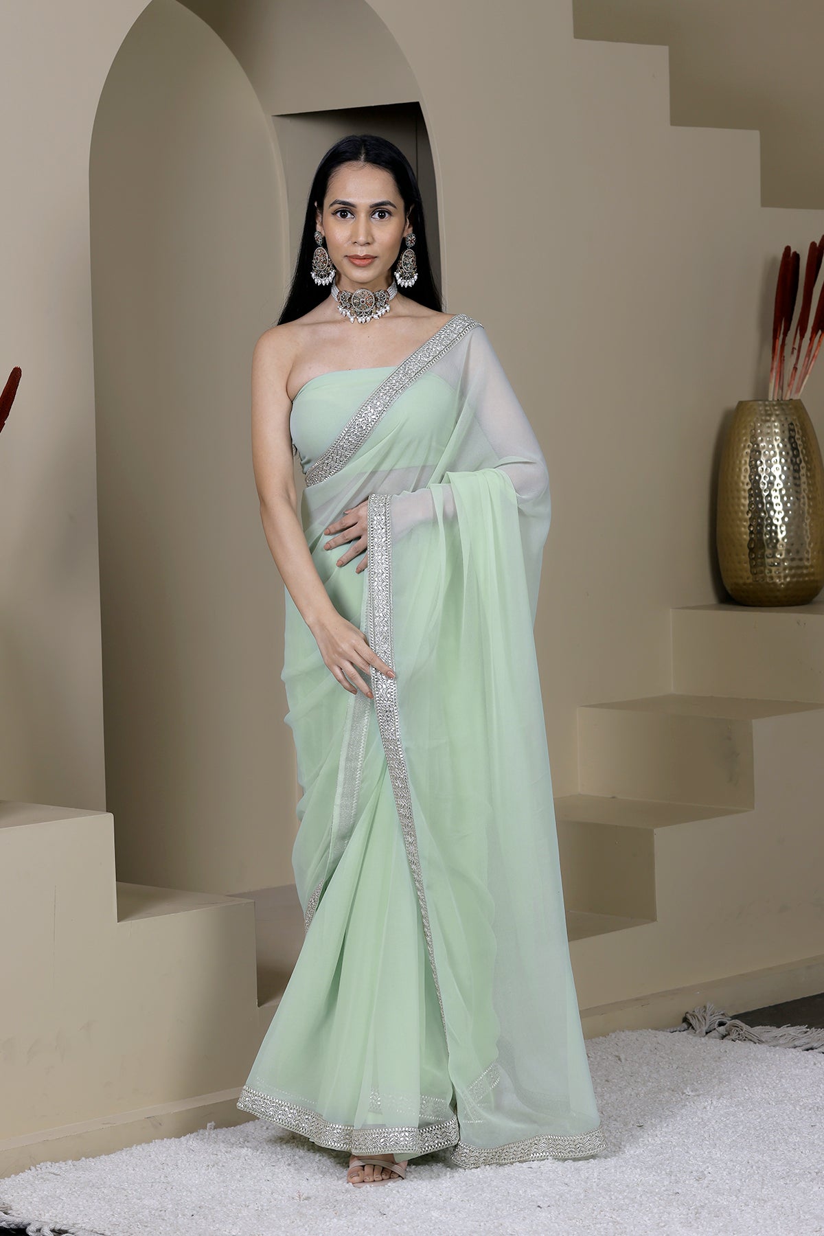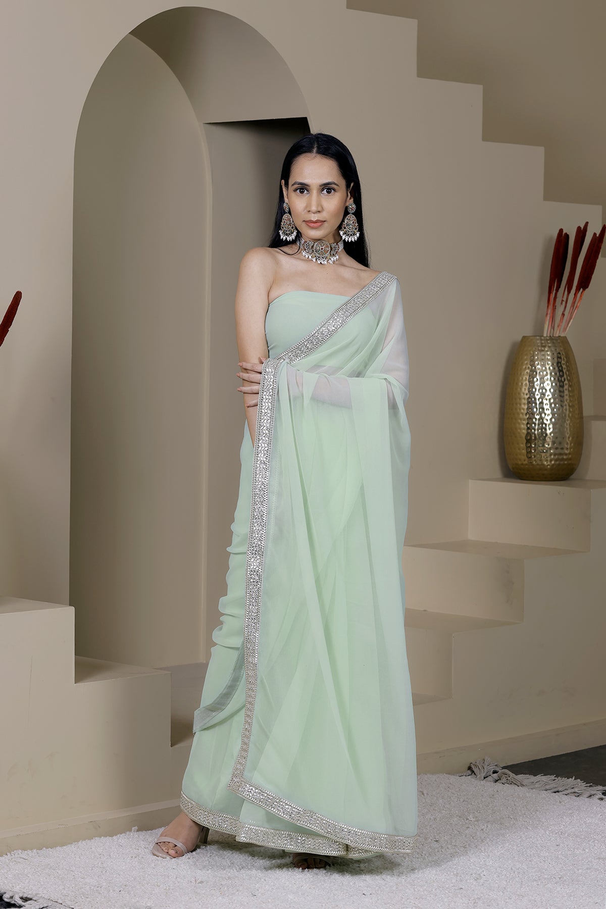This pista green lightweight georgette saree with gold lace detailing exudes luxury, glam, and classy royalty. Elevate your style with this elegant and exclusive piece from the Suhani Saree Collection.