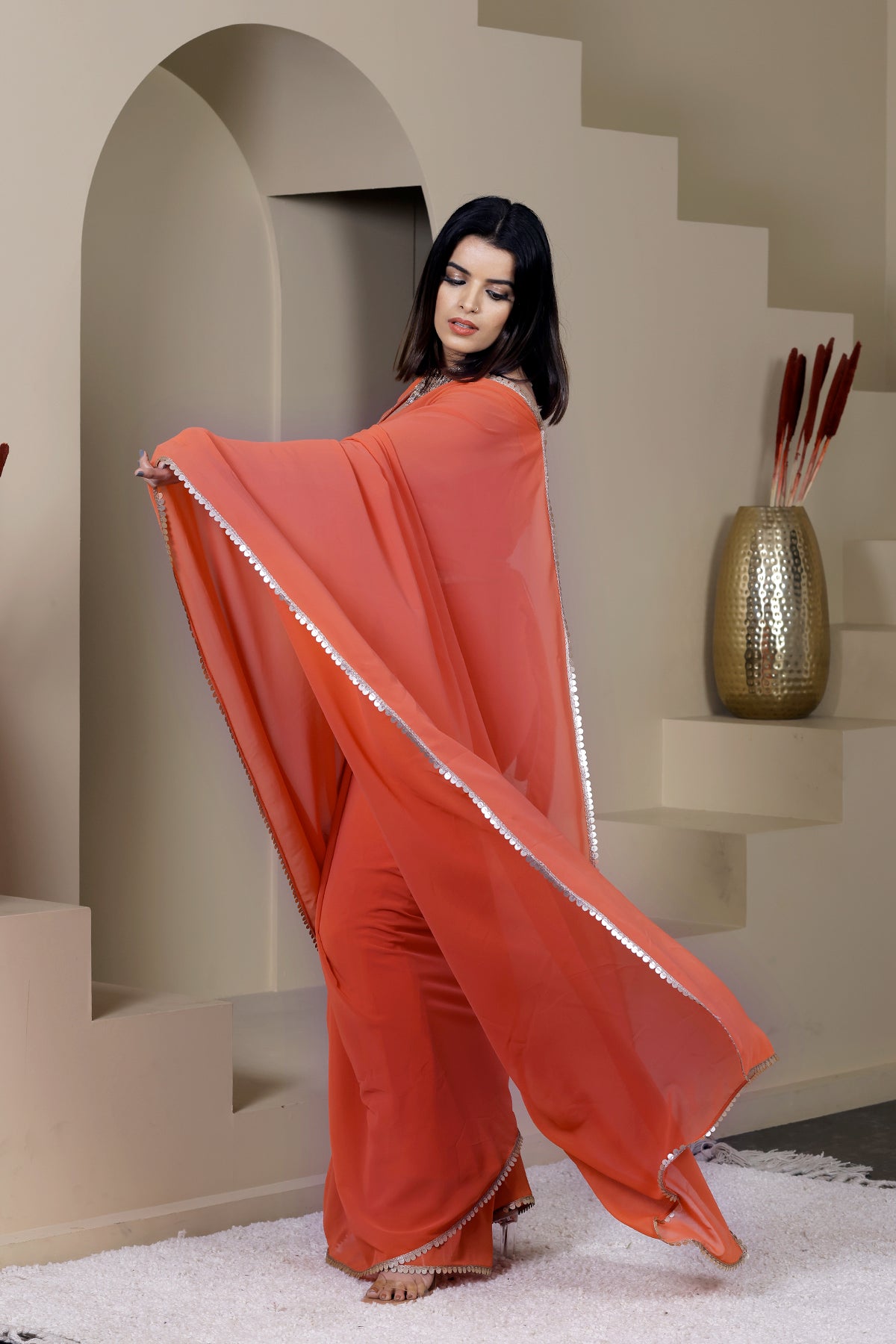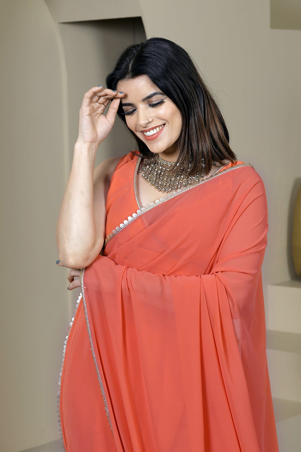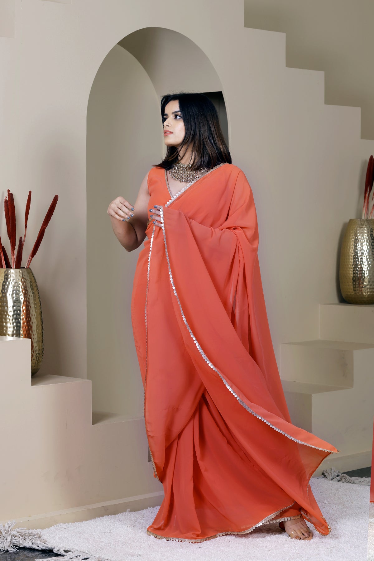 This orange lightweight georgette saree with gold lace detailing exudes luxury, glam, and classy royalty. Elevate your style with this elegant and exclusive piece from the Suhani Saree Collection.