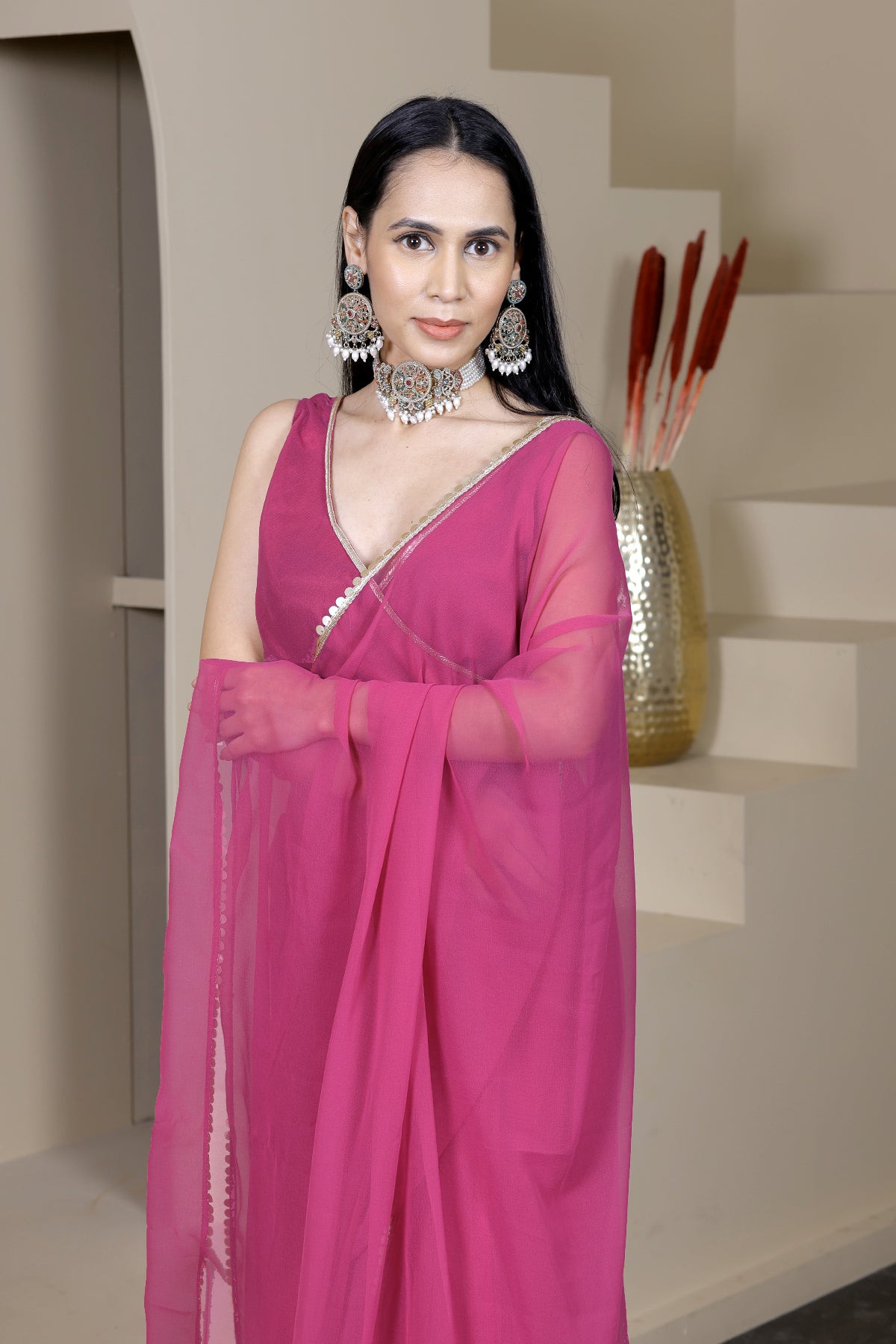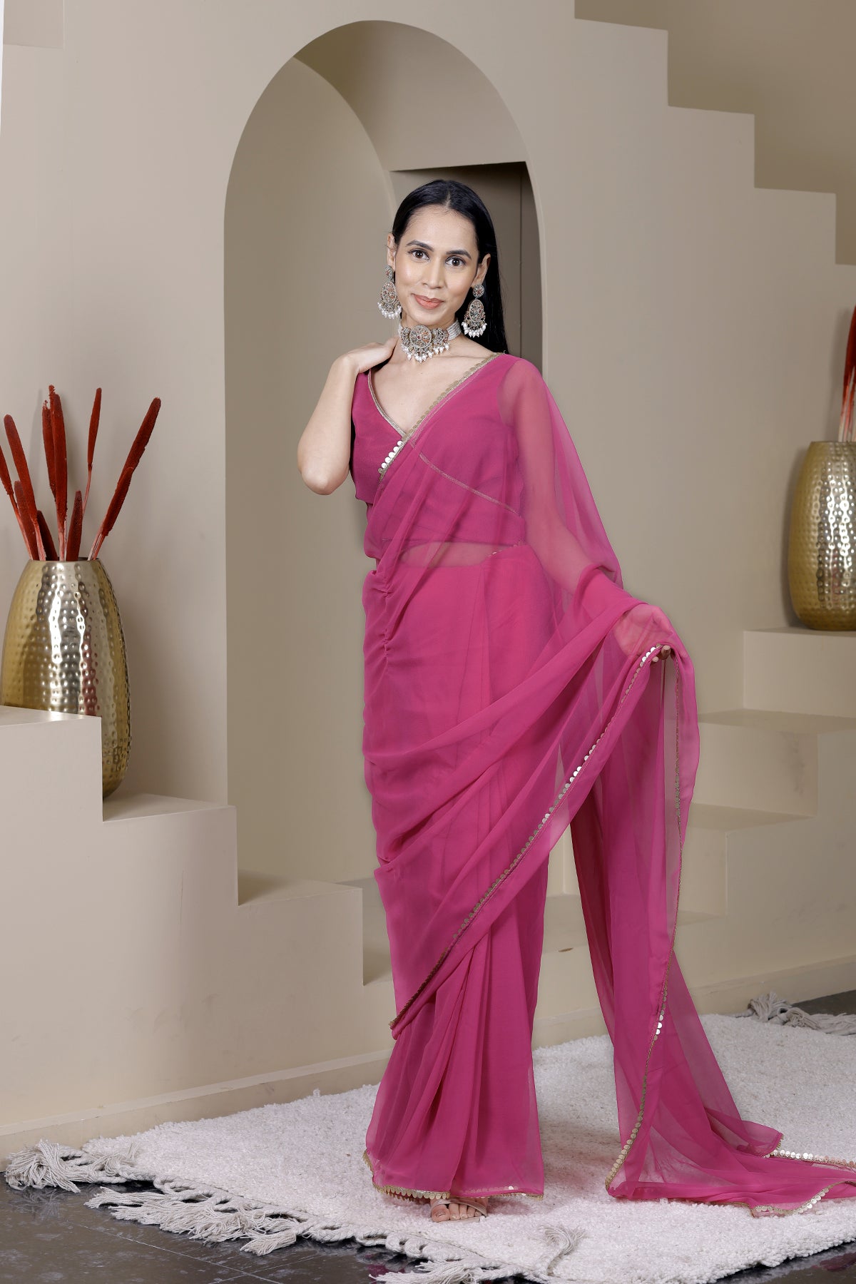 This pink lightweight georgette saree with gold lace detailing exudes luxury, glam, and classy royalty. Elevate your style with this elegant and exclusive piece from the Suhani Saree Collection.