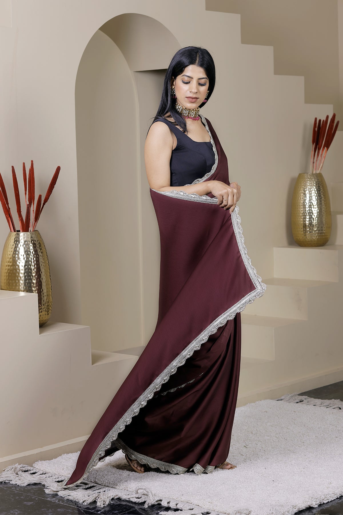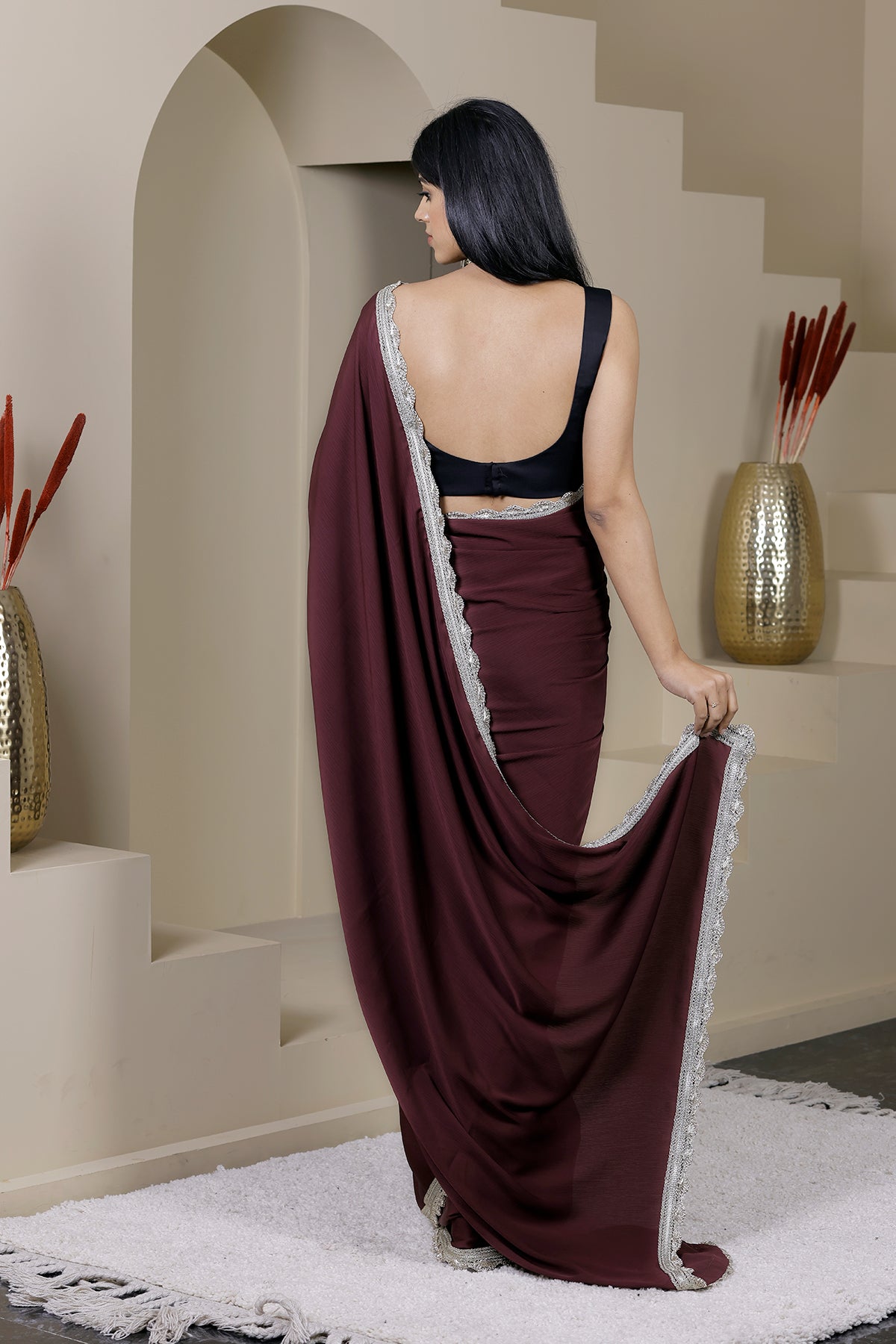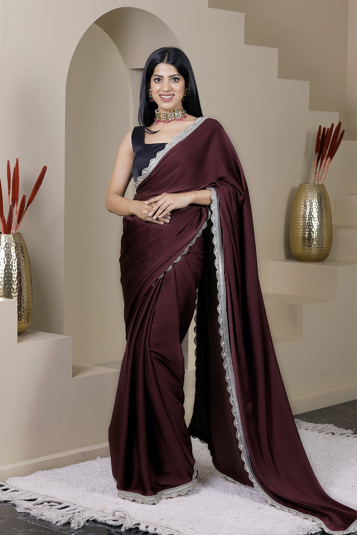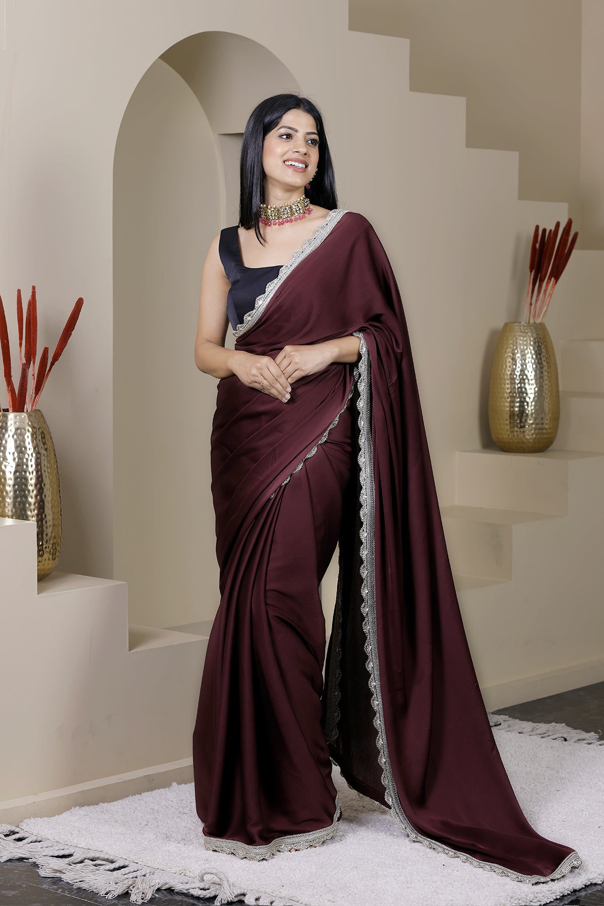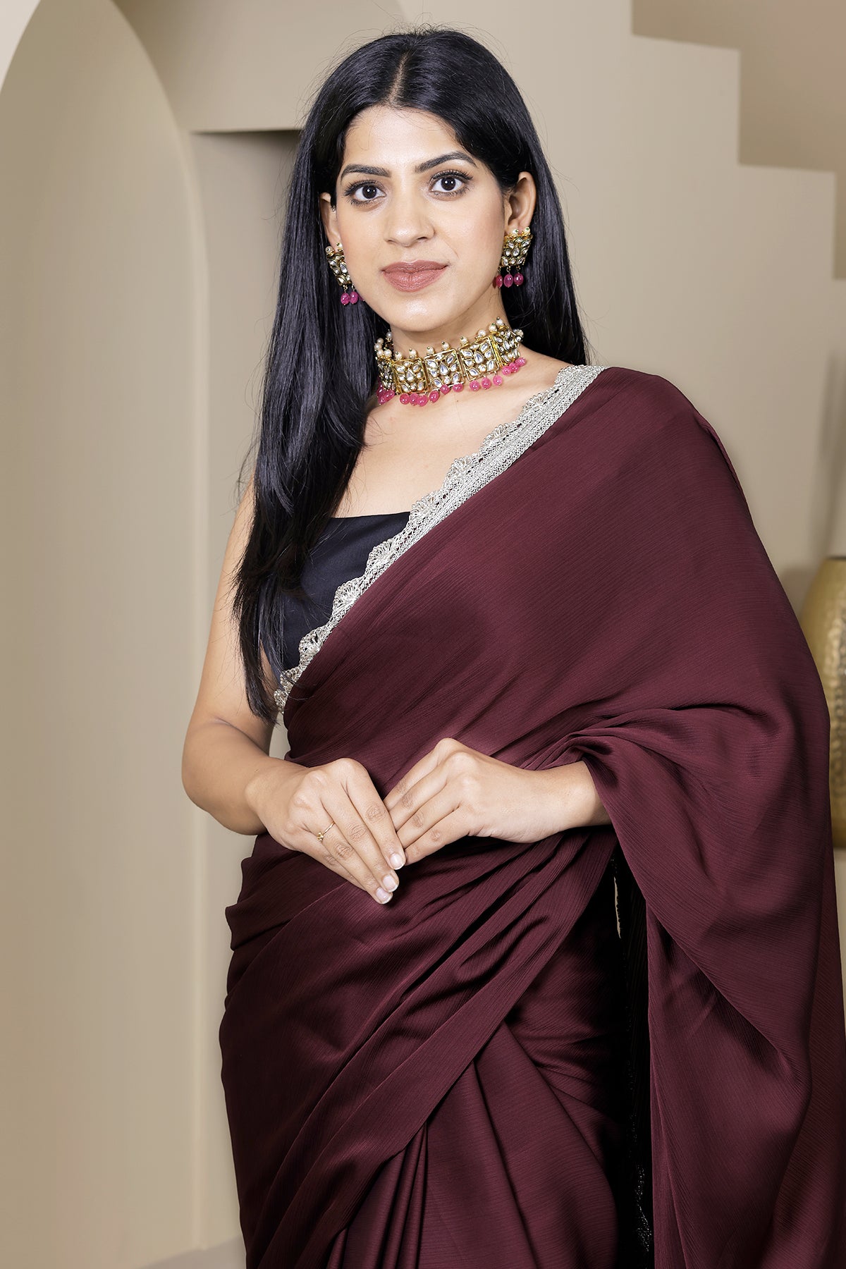 This mauve colored satin chiffon saree with gold border exudes luxury, glam, and classy royalty. Elevate your style with this elegant and exclusive piece from the Gulaal Saree Collection.