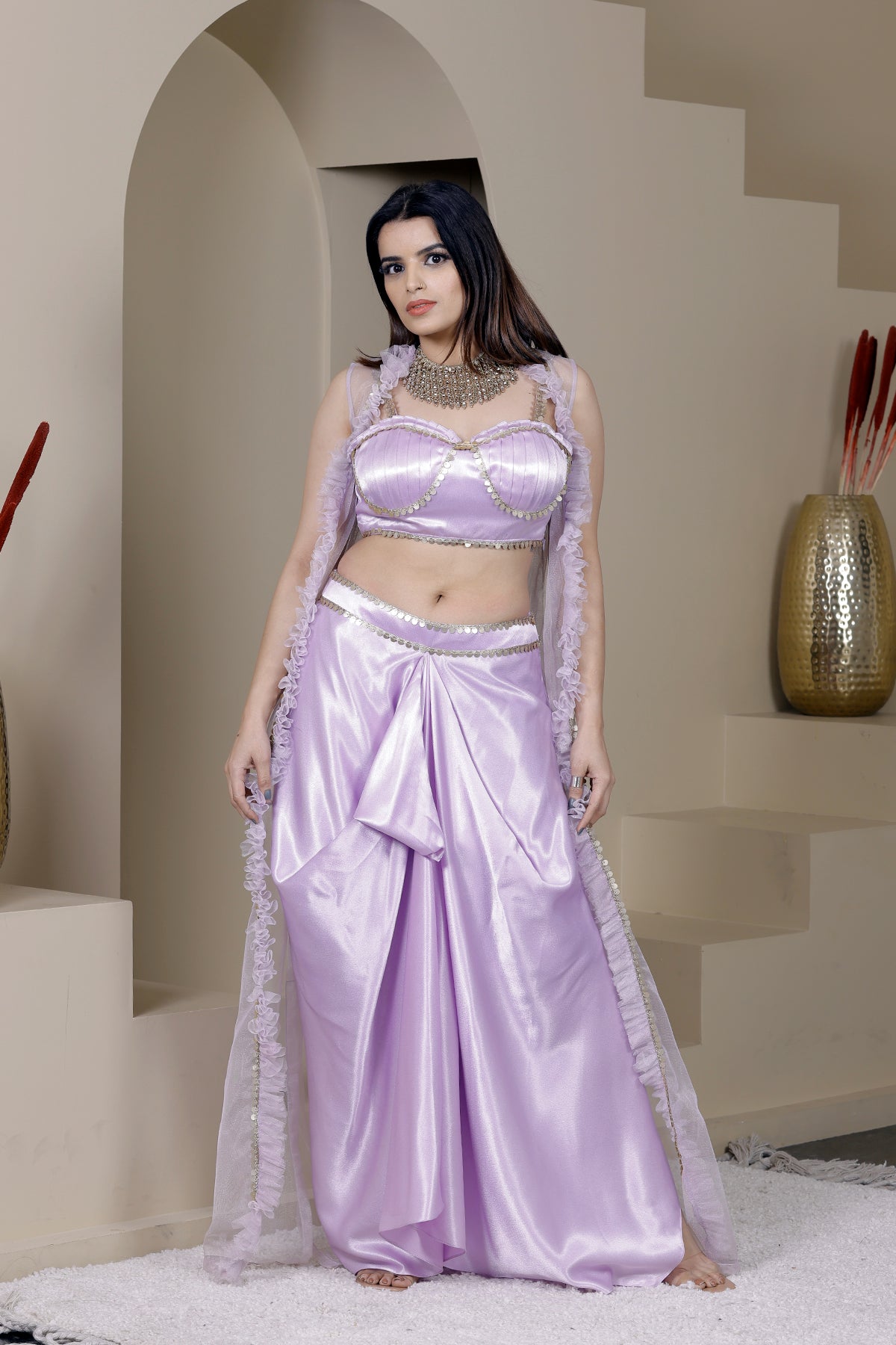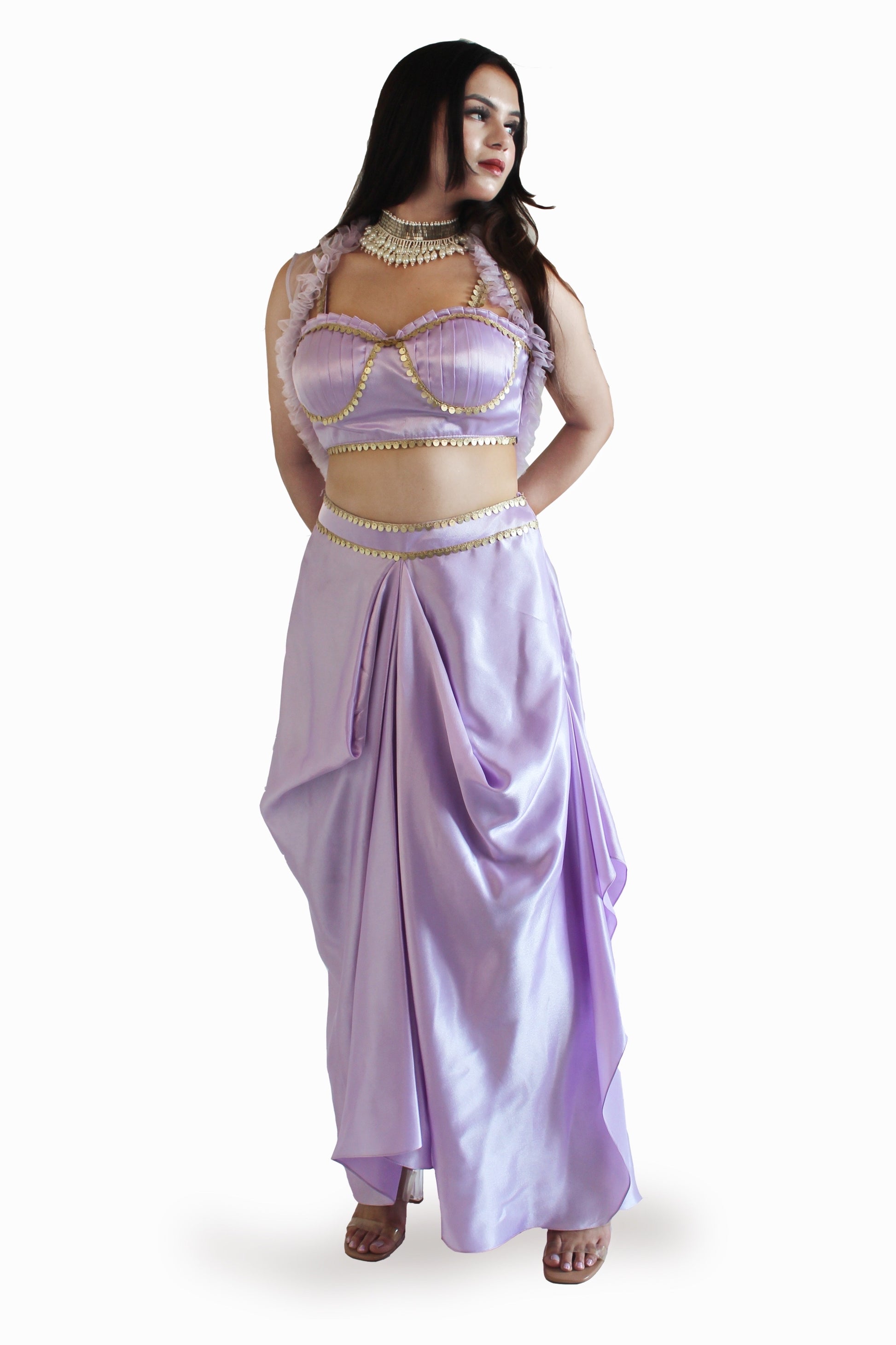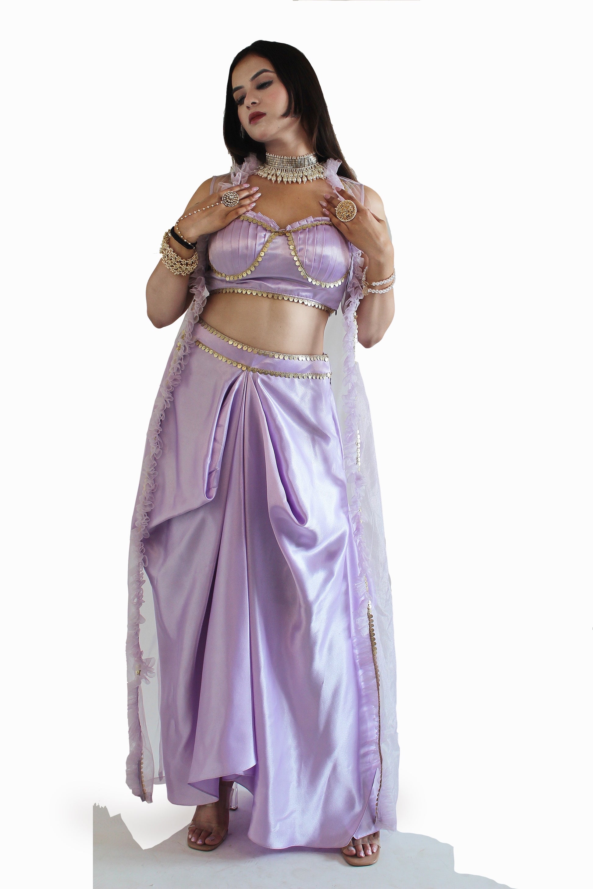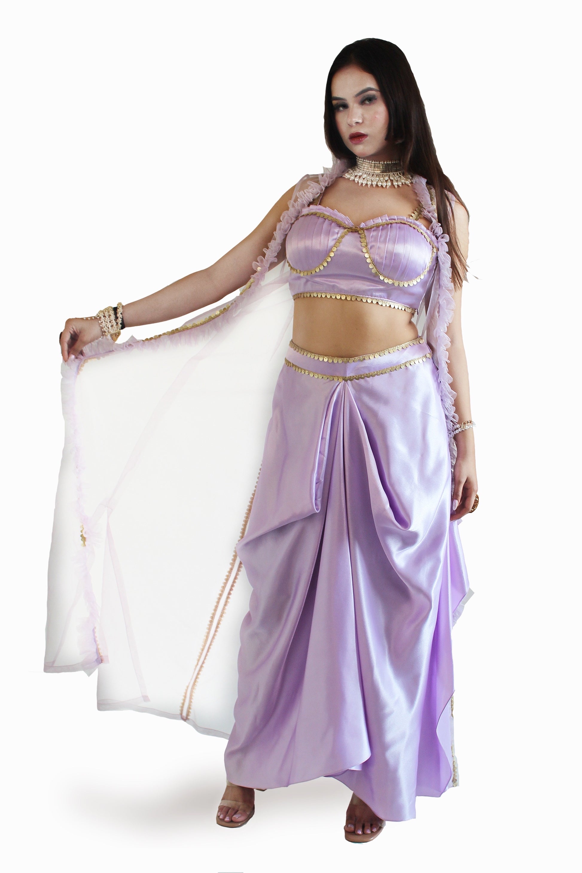 This is for you if you want to stand out in the crowd with our Ashiqui Festive Fiesta Cape Set. Designed for the bold and playful, this 3 piece set features a draped skirt, bralette top, and cape in season's favorite lavender color. The luxurious pleated top, draped bottom and shimmer net cape with gold lace detailing adds a touch of class, making you the ultimate sexy fashionista. Perfect for weddings and festivities, this set is a dream come true!