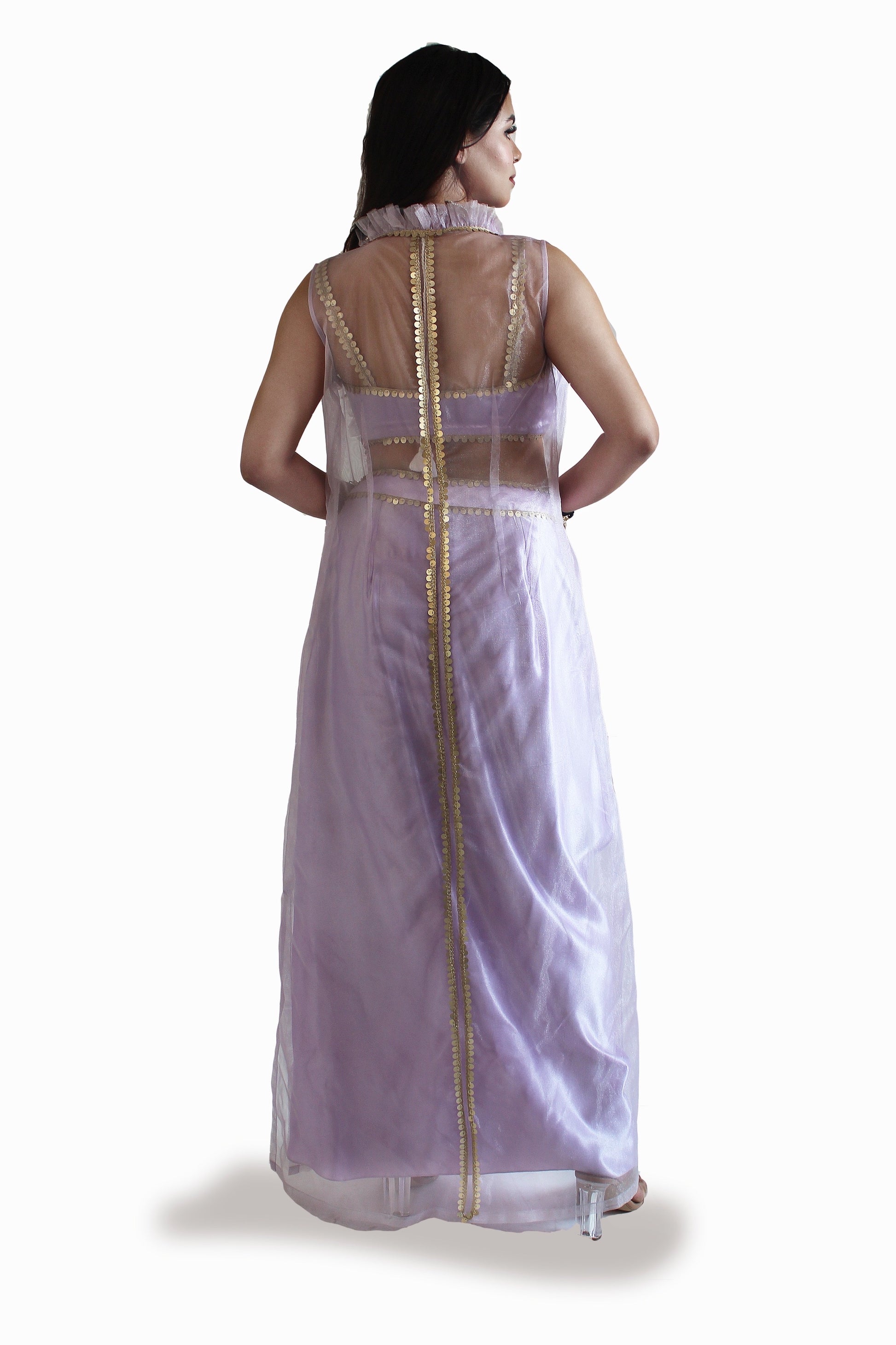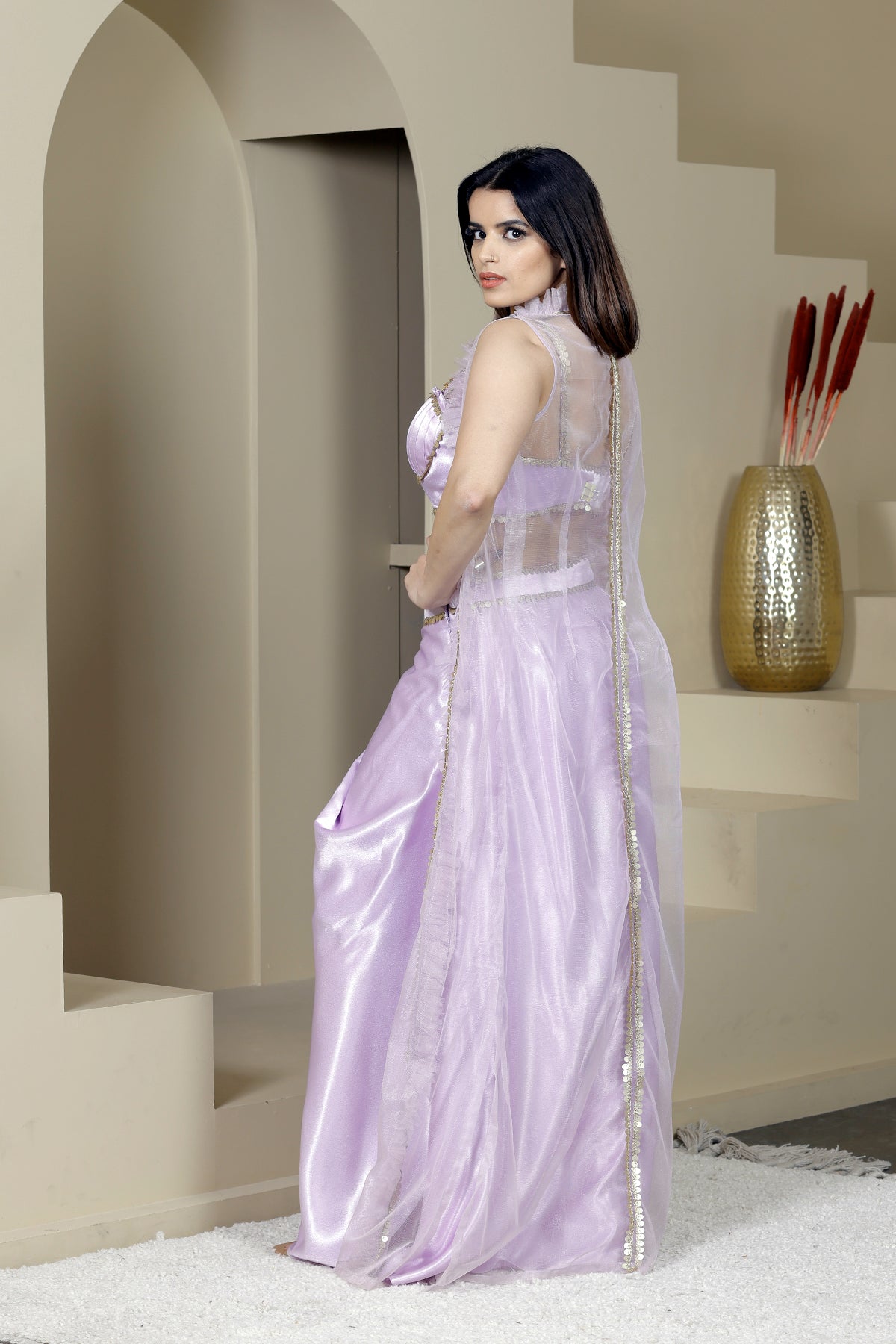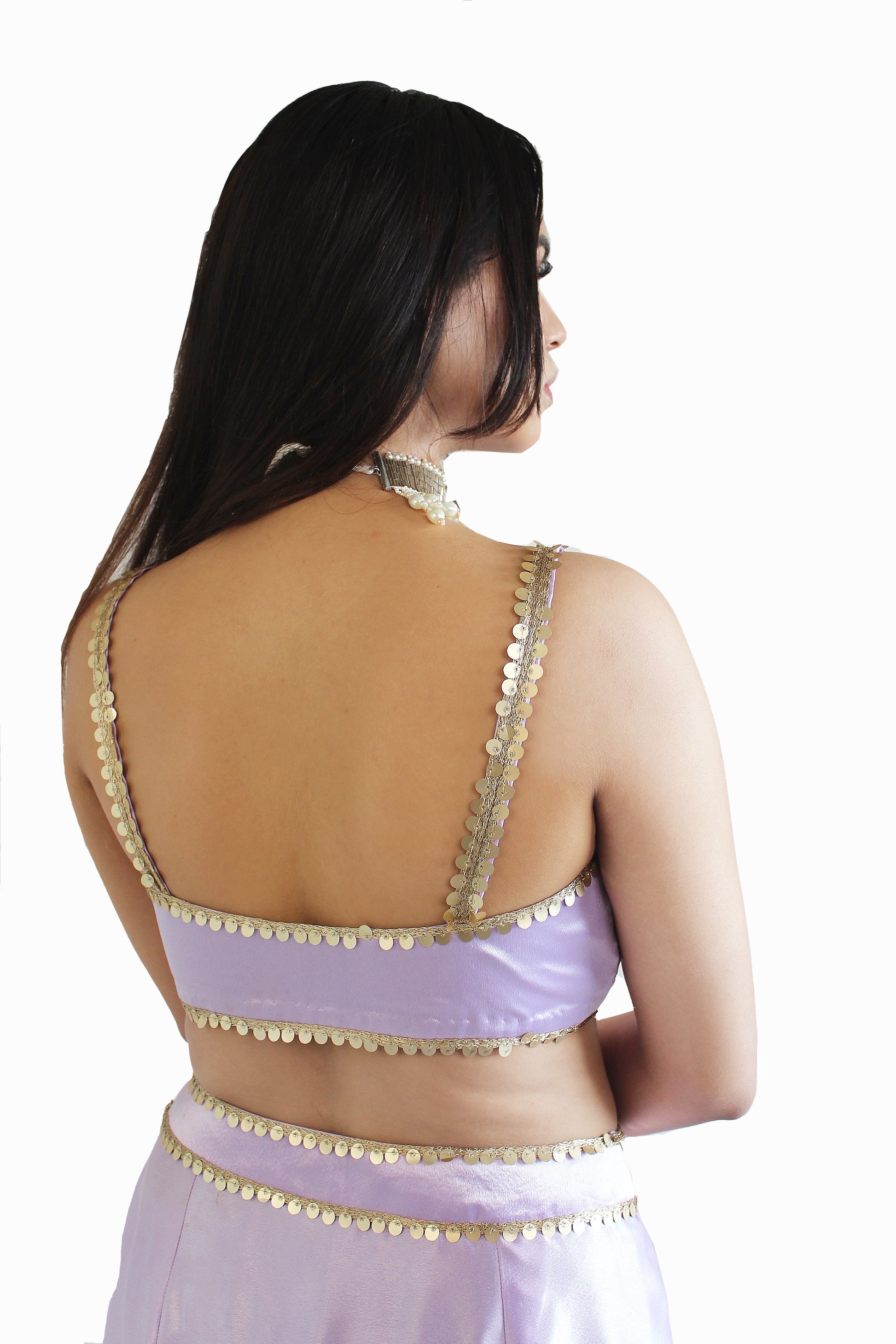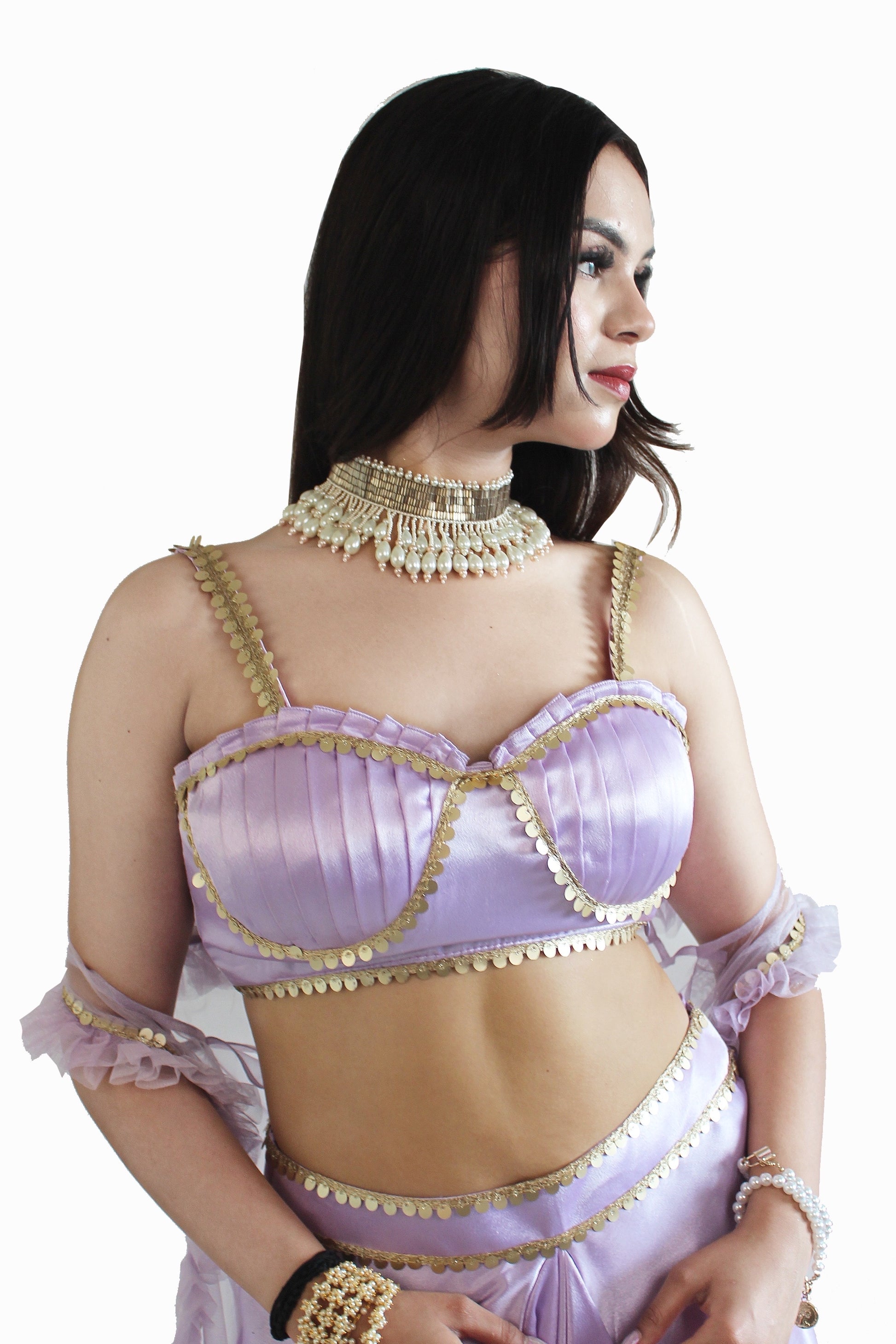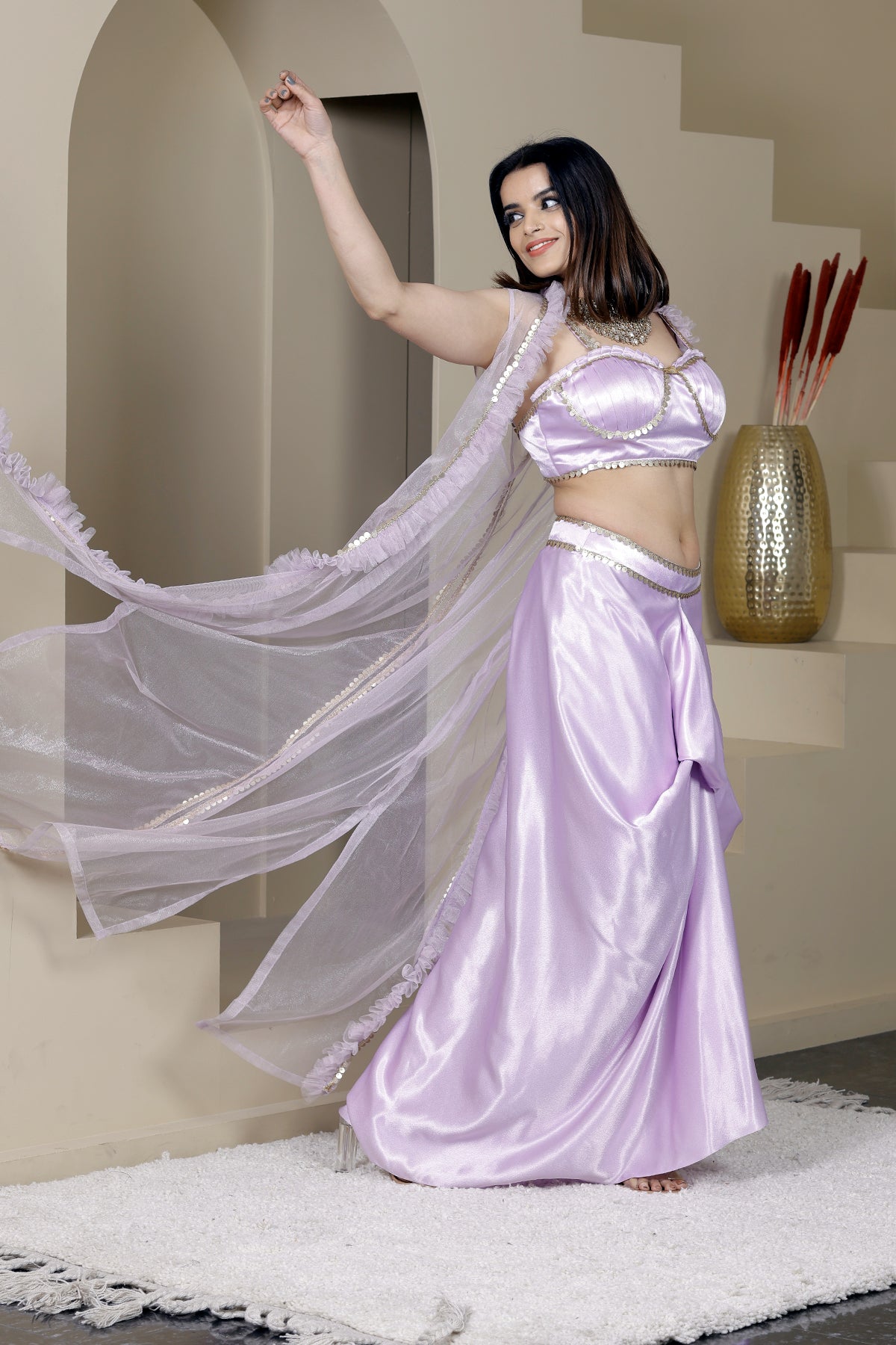 This is for you if you want to stand out in the crowd with our Ashiqui Festive Fiesta Cape Set. Designed for the bold and playful, this 3 piece set features a draped skirt, bralette top, and cape in season's favorite lavender color. The luxurious pleated top, draped bottom and shimmer net cape with gold lace detailing adds a touch of class, making you the ultimate sexy fashionista. Perfect for weddings and festivities, this set is a dream come true!
