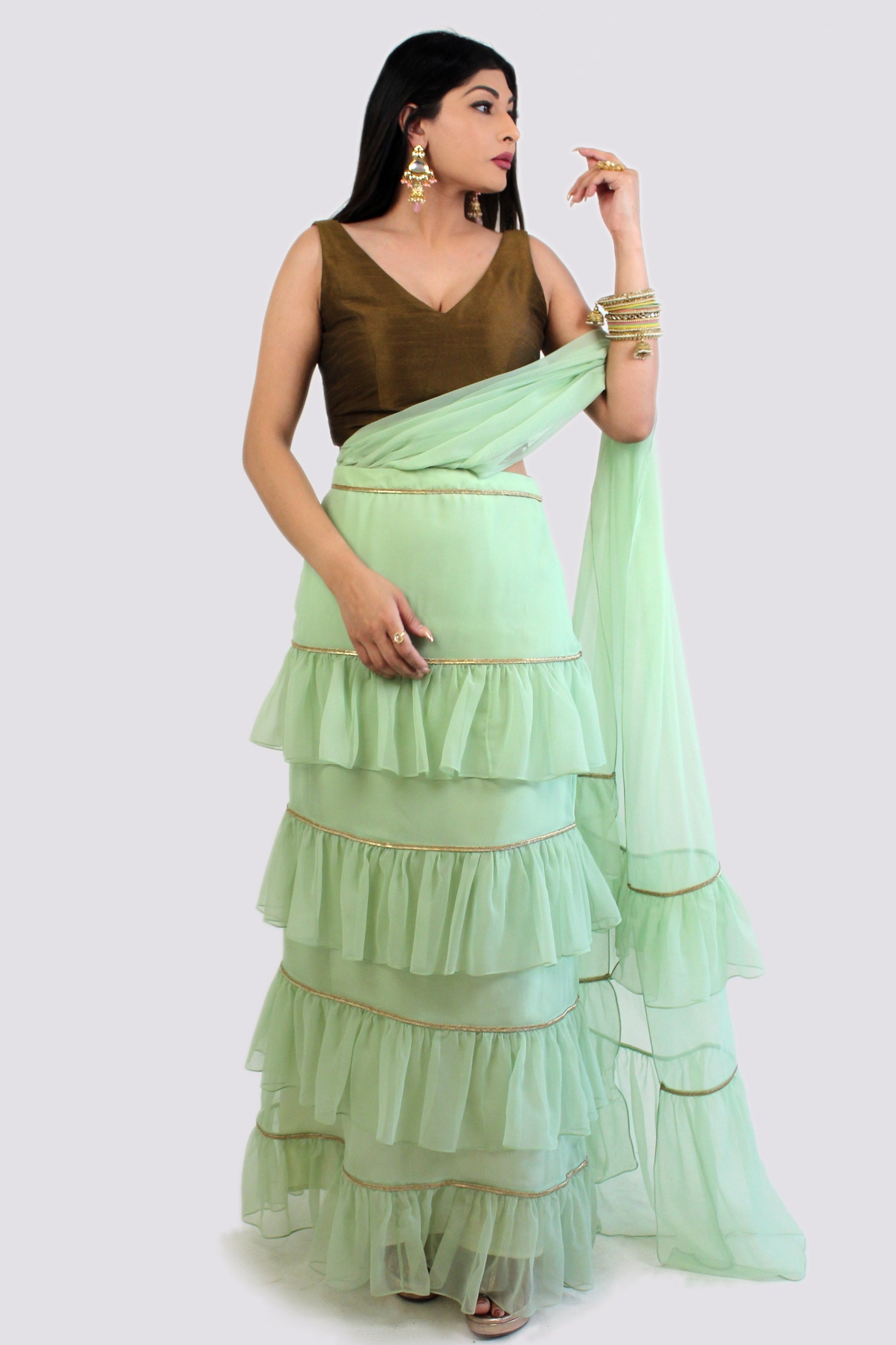Elevate your ethnic wardrobe with the Noor Pre-Stitched Saree! This lively and refreshing high waisted saree features delicate breezy georgette frills in layers and a vibrant color that's perfect for any festive occasion. Perfect for festivals, parties, or weddings, this saree comes with unstitched blouse fabric in contrasting color this saree set is guaranteed to turn heads and earn compliments.