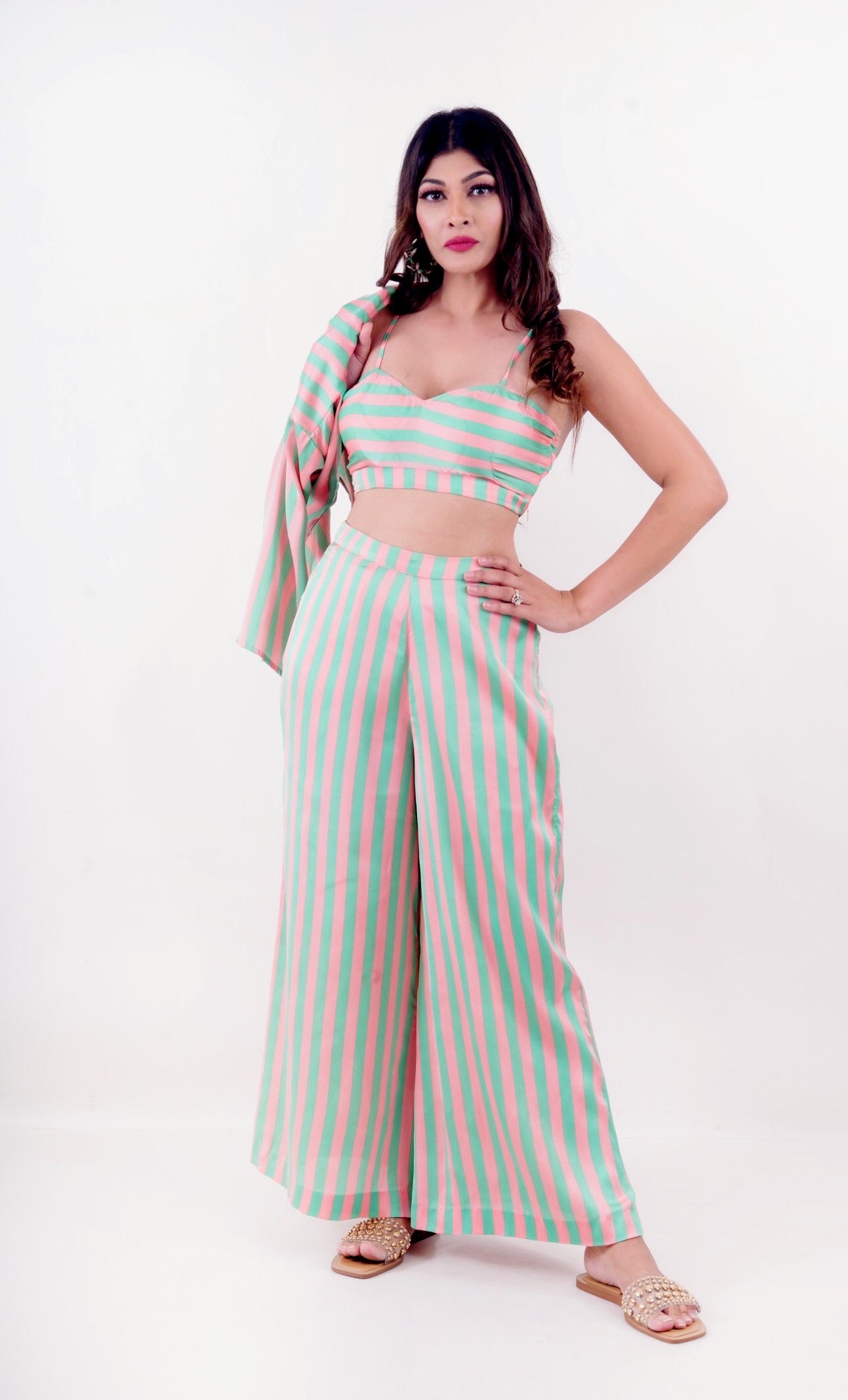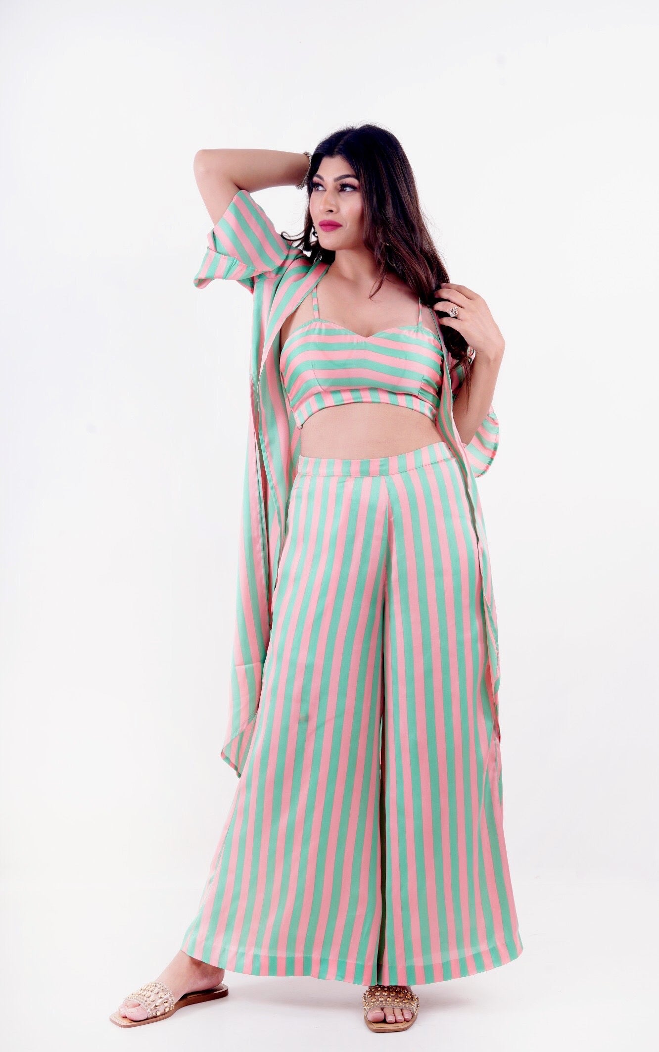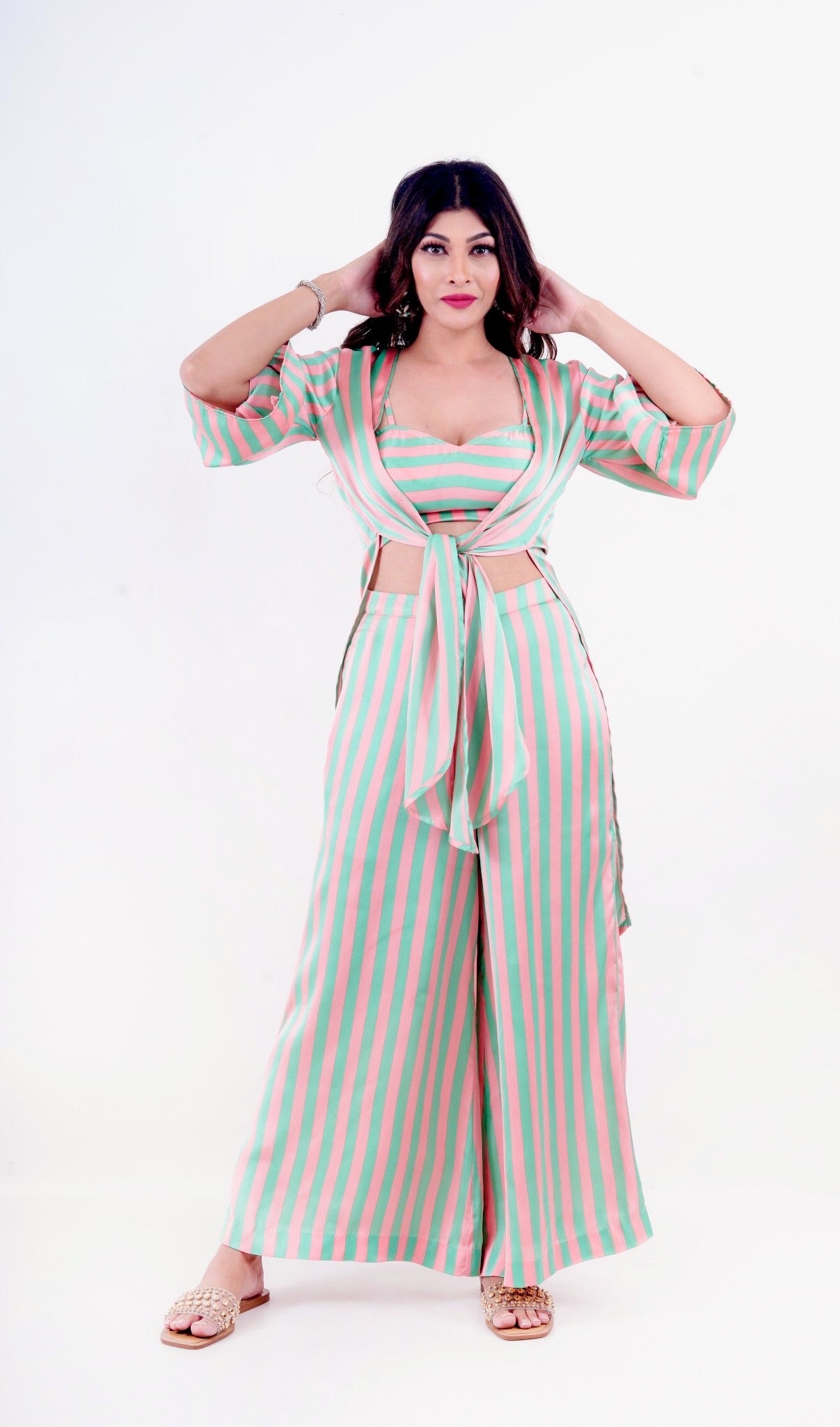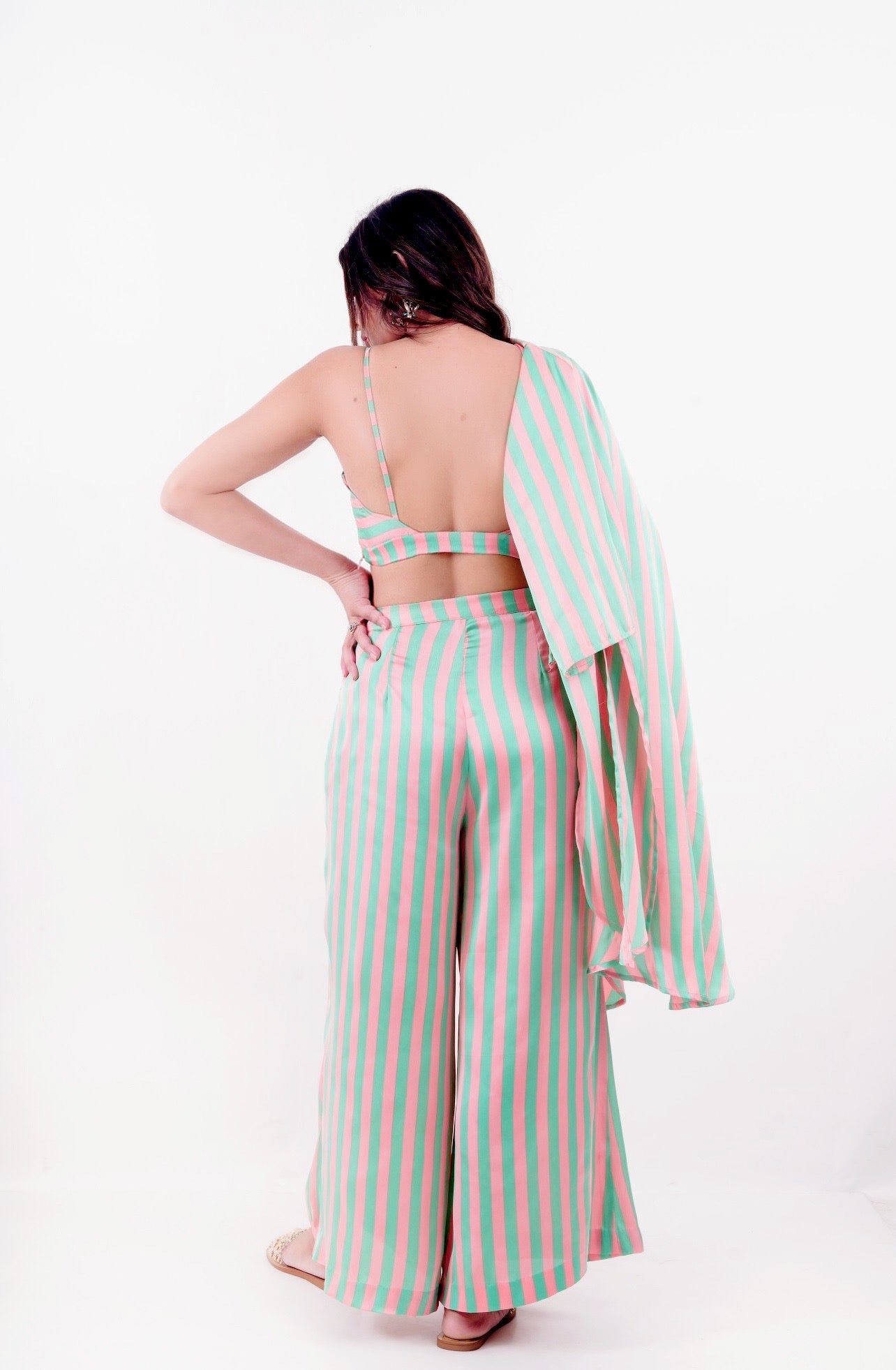 Kick your style into overdrive with the Rewind 3 Piece Co-ord set. It comes with a spaghetti backless crop top, high waist pants, and a quarter sleeve cape, for a stripey look that's both comfy and chic. Whether you choose to wear with or without the cape, you'll look flattering and on-trend. Make a statement and turn heads with its unique design. Classy, fun, and playful - this one’s a surefire win.