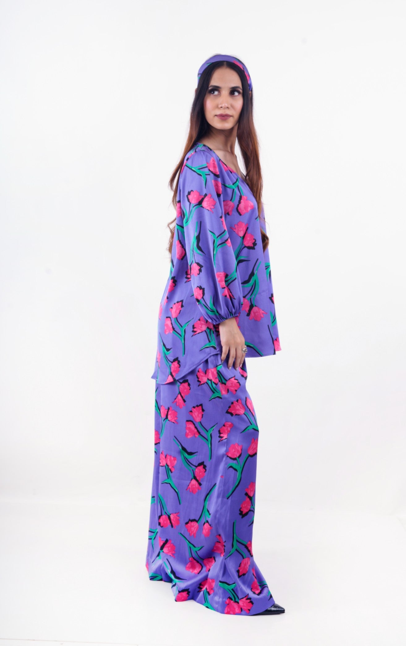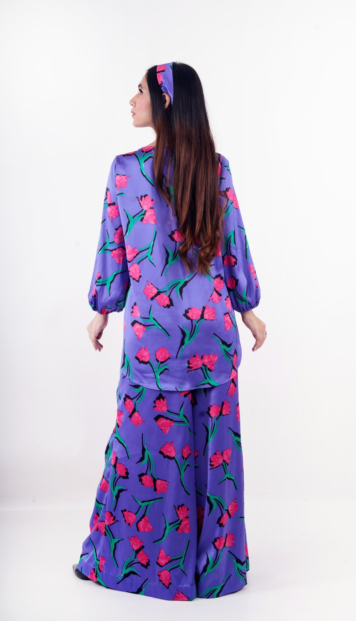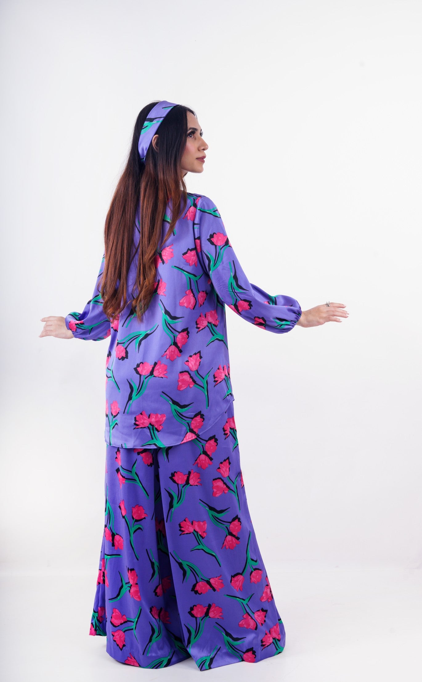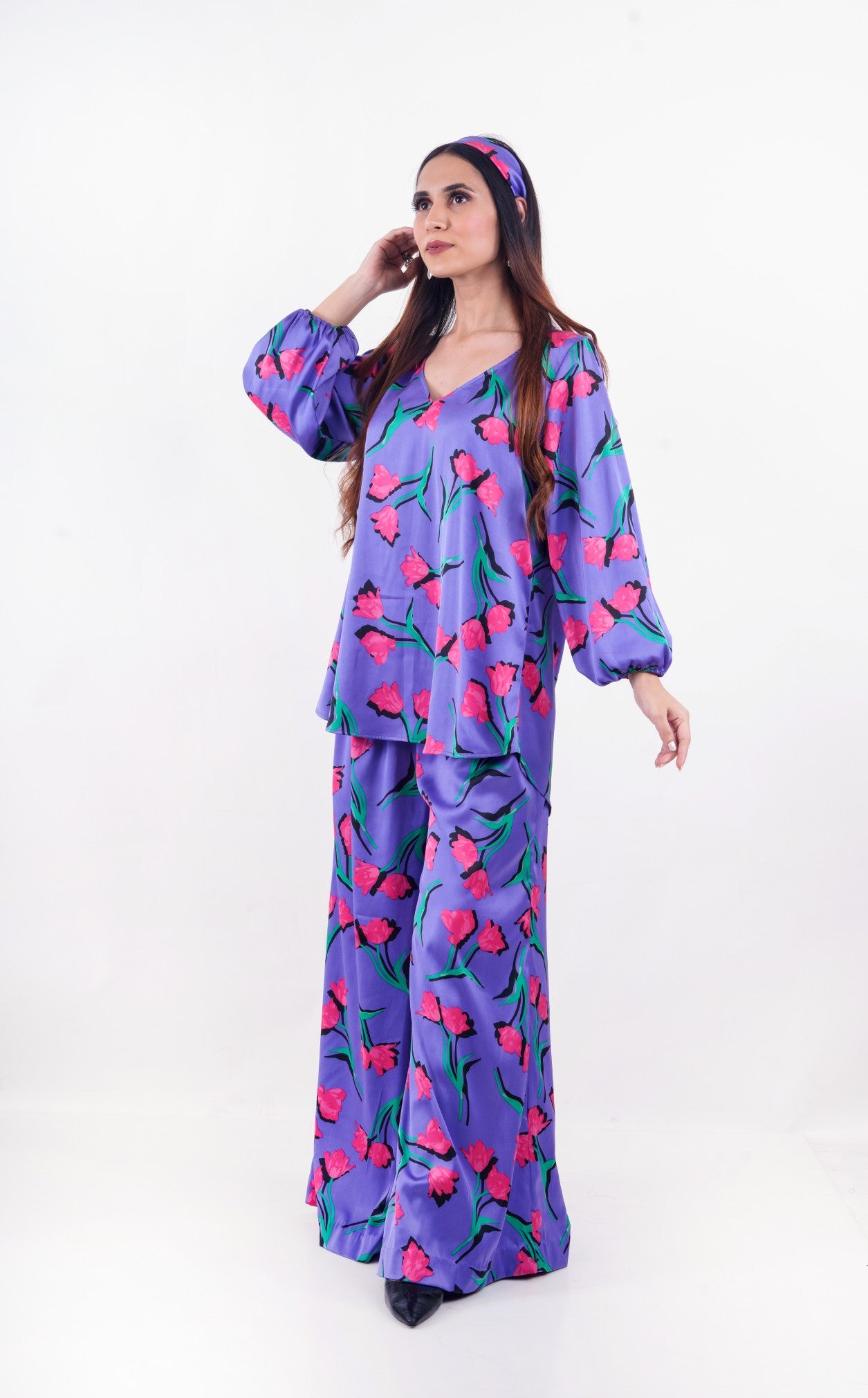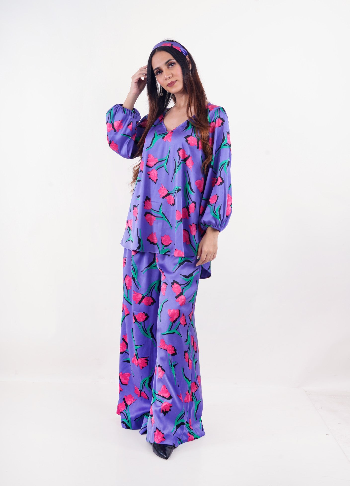 Add pizazz to your wardrobe with oh-so-stylin' Voilla purple-print co-ord set! Watching the comfy long sleeve top paired up with comfy plazzo pants will be love at first sight. Ready for anything, these babies make any outing—retro party, brunch date, shopping spree—a breeze. Look good and feel great every day with an ensemble that's right for any mood.