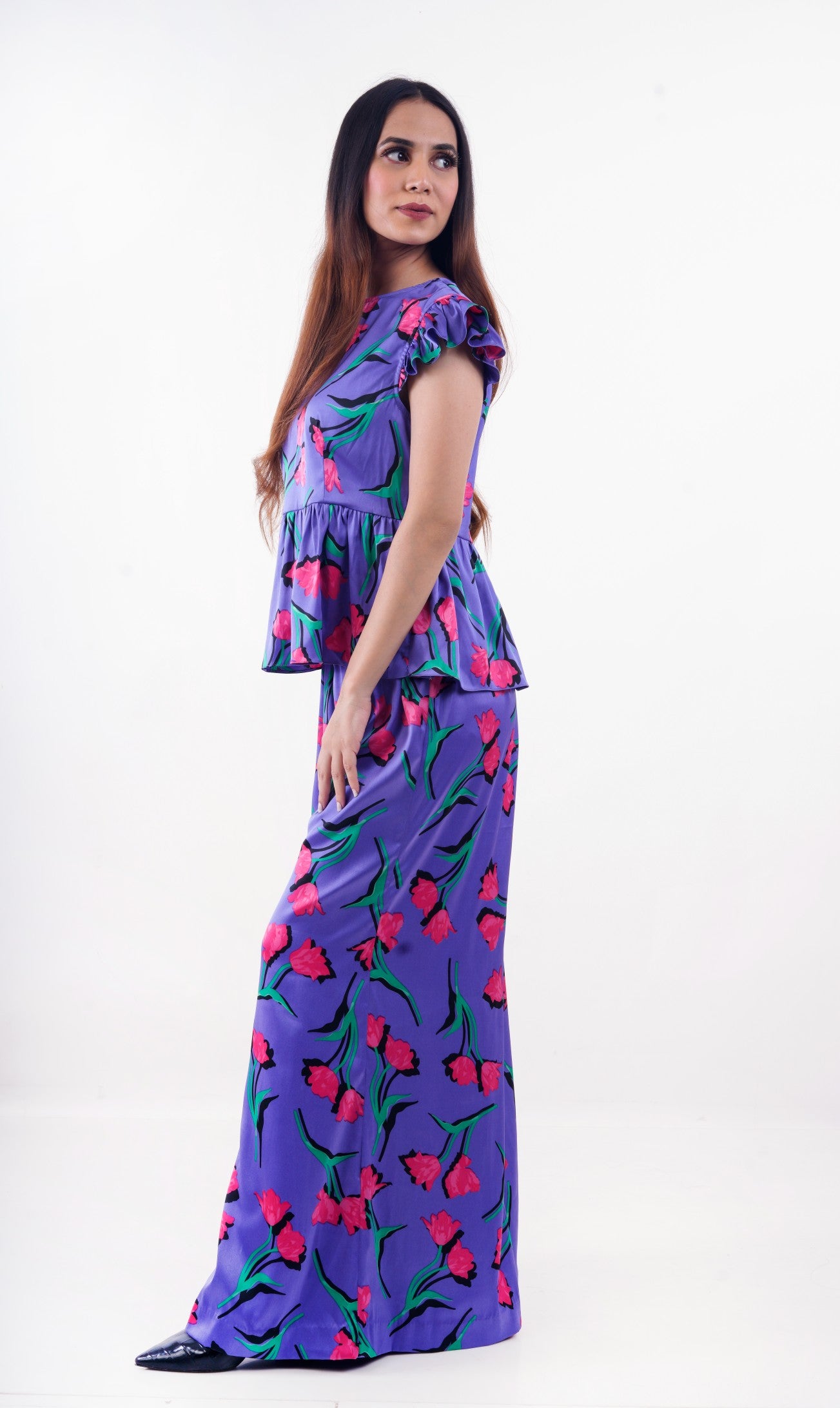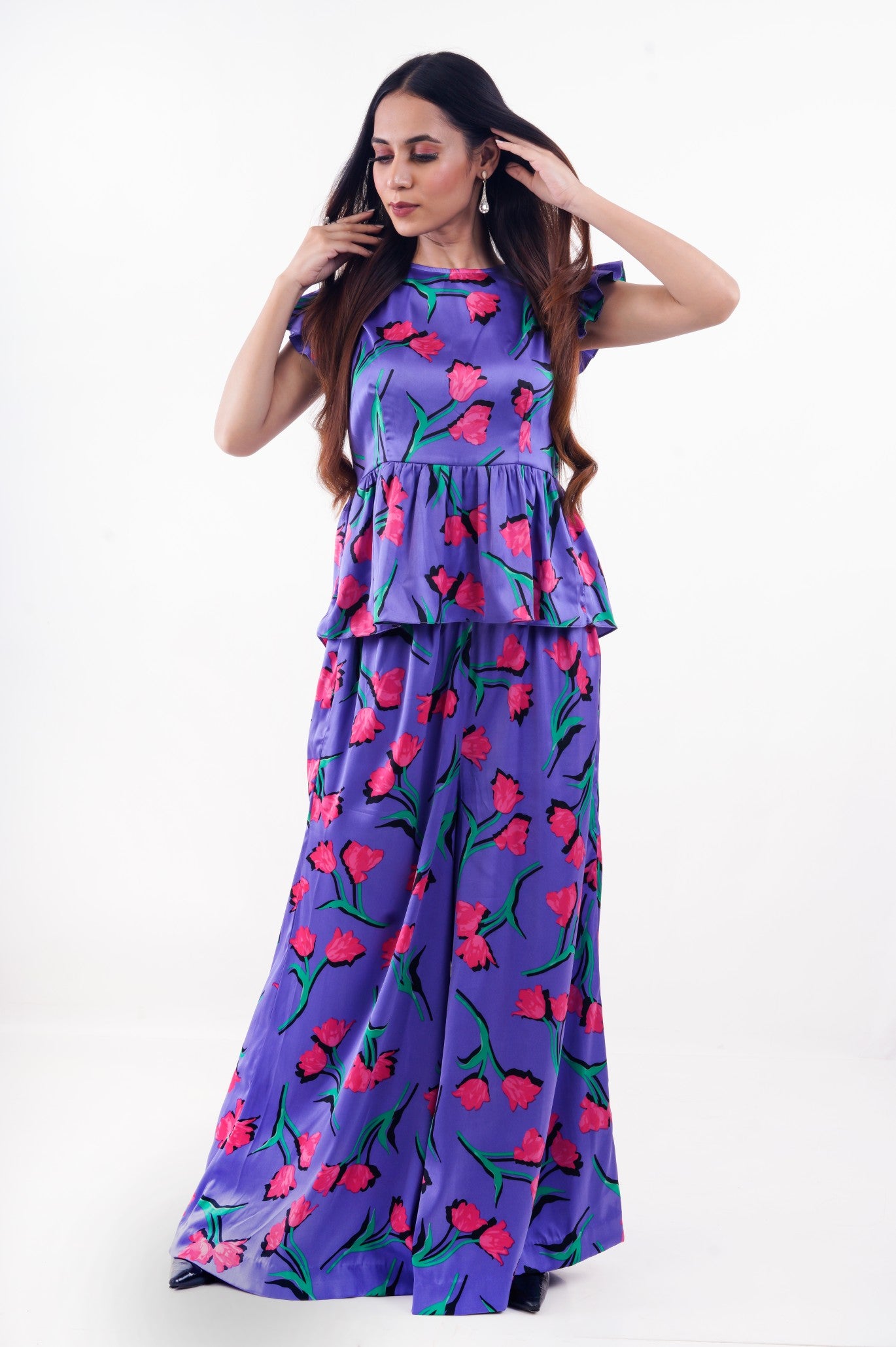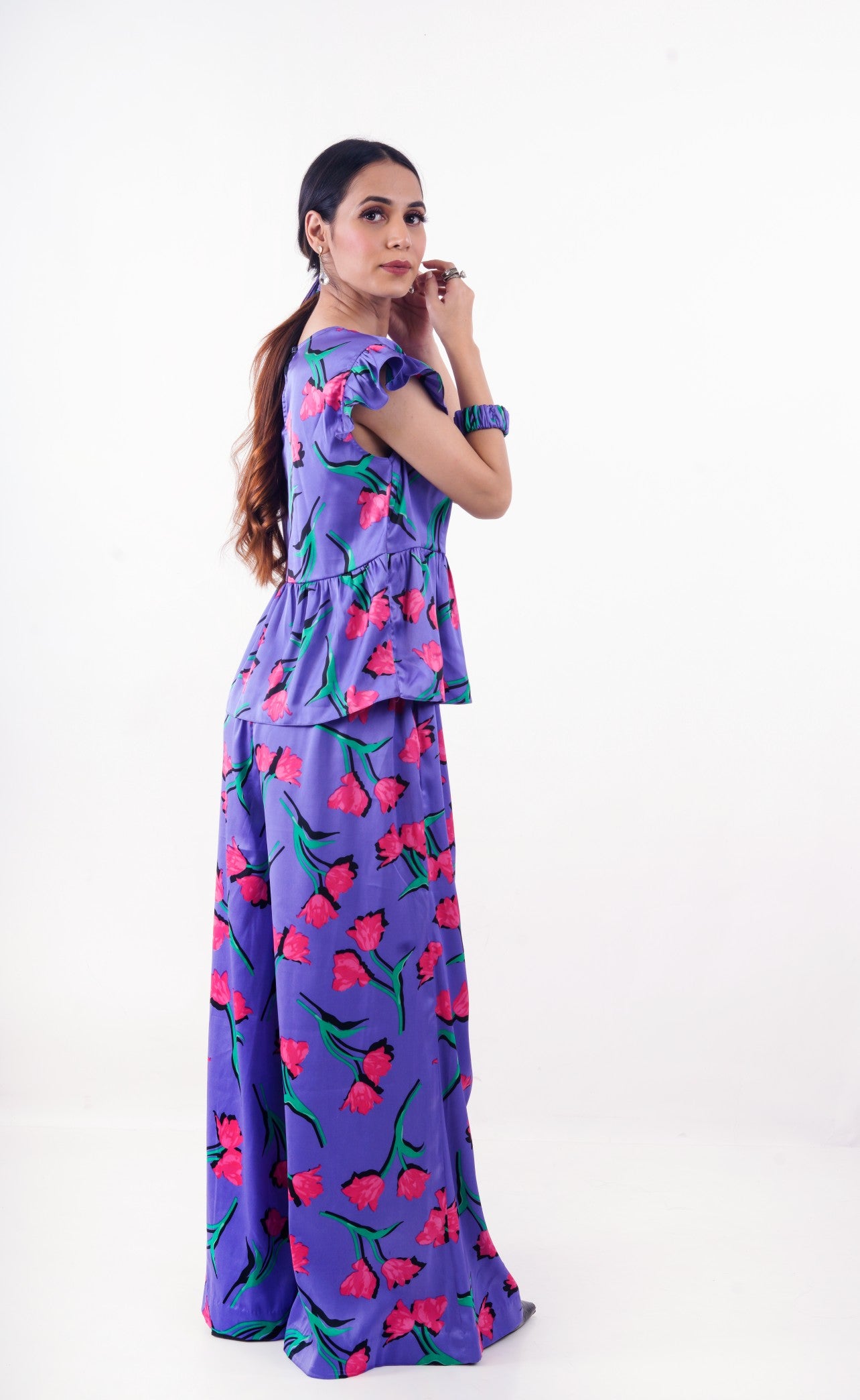 Treat yourself to this purpled-up printed Voilla Frill Top & Plazzo Pants co-ord set!