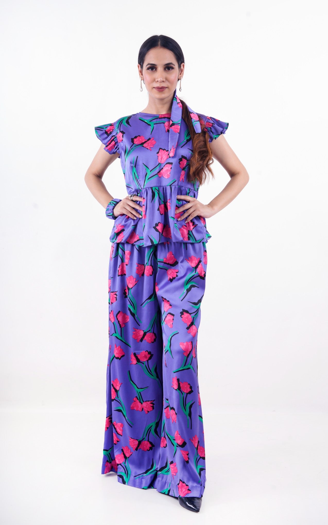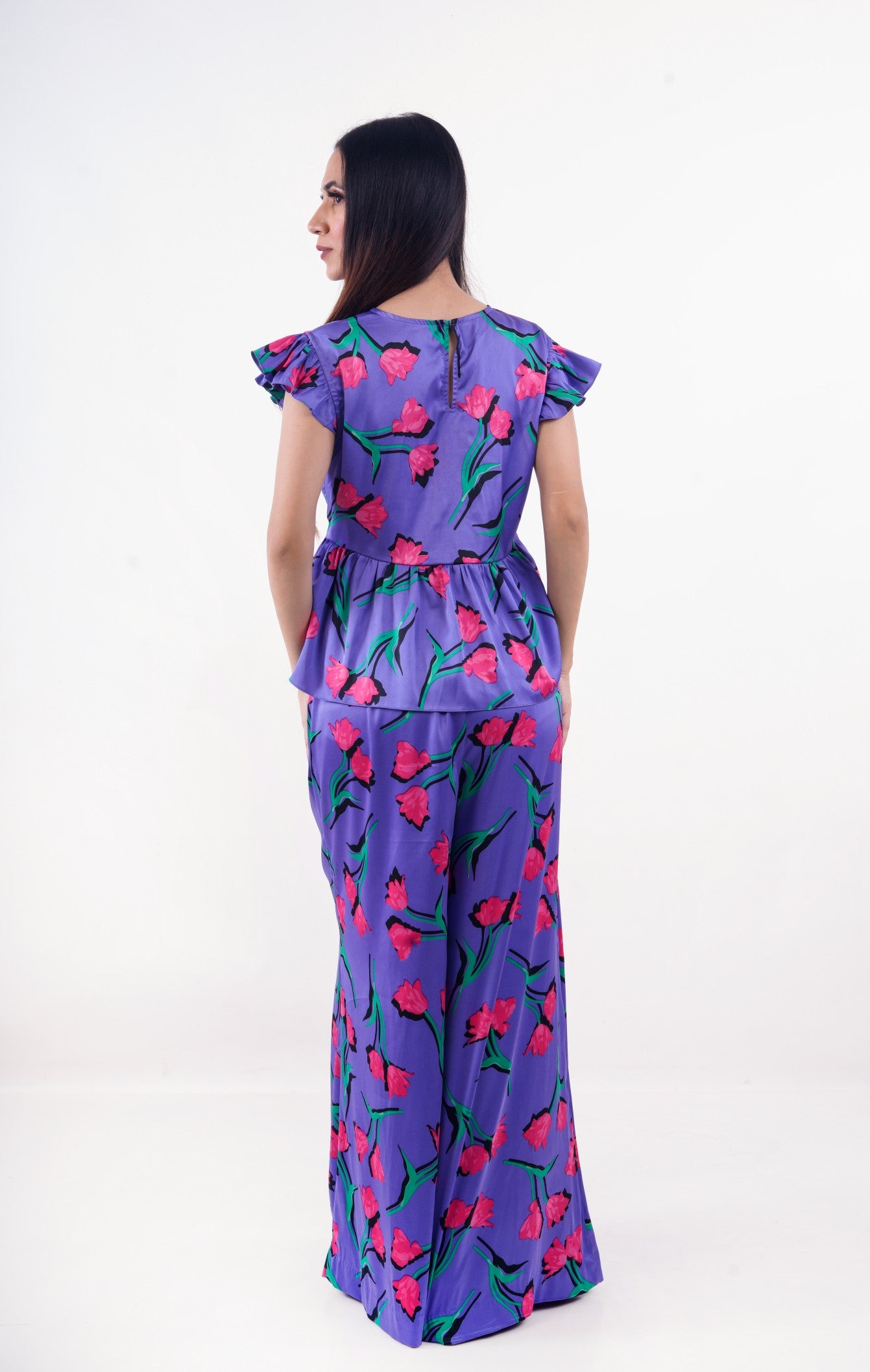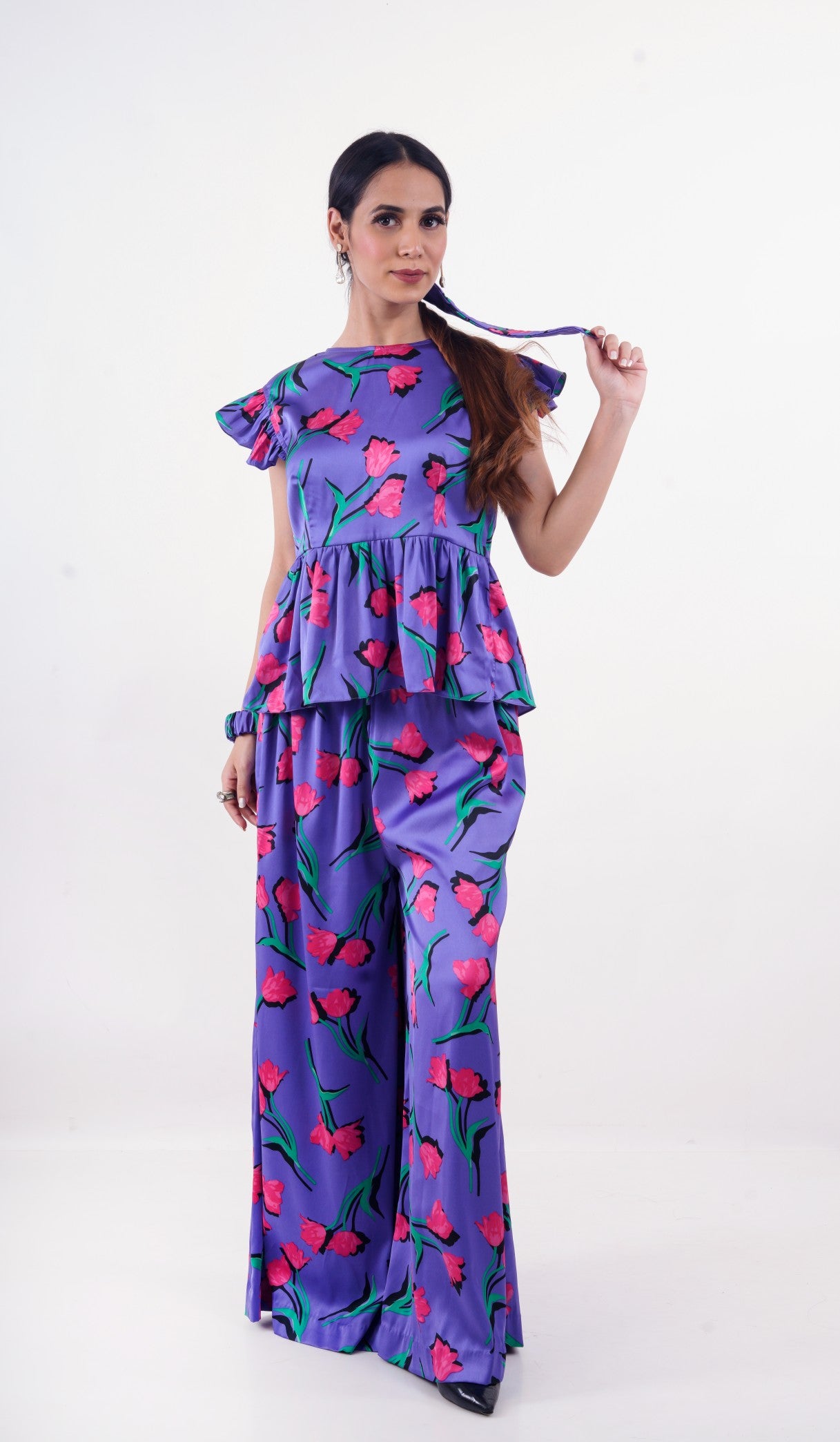 Treat yourself to this purpled-up printed Voilla Frill Top & Plazzo Pants co-ord set!